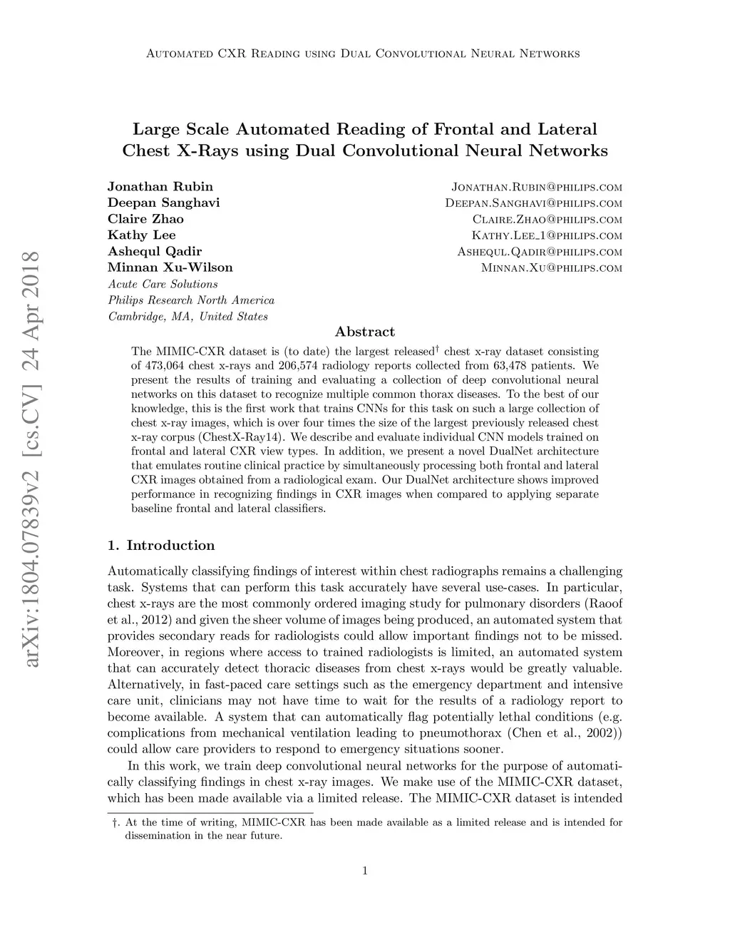The MIMIC-CXR dataset is (to date) the largest publicly released chest x-ray dataset consisting of 473,064 chest x-rays and 206,574 radiology reports collected from 63,478 patients. We present the results of training and evaluating a collection of deep convolutional neural networks on this dataset to recognize multiple common thorax diseases. To the best of our knowledge, this is the first work that trains CNNs for this task on such a large collection of chest x-ray images, which is over four times the size of the largest previously released chest x-ray corpus. We describe and evaluate individual CNN models trained on frontal and lateral CXR view types. In addition, we present a novel DualNet architecture that emulates routine clinical practice by simultaneously processing both frontal and lateral CXR images obtained from a radiological exam. Our DualNet architecture shows improved performance in recognizing findings in CXR images when compared to applying separate baseline frontal and lateral classifiers.