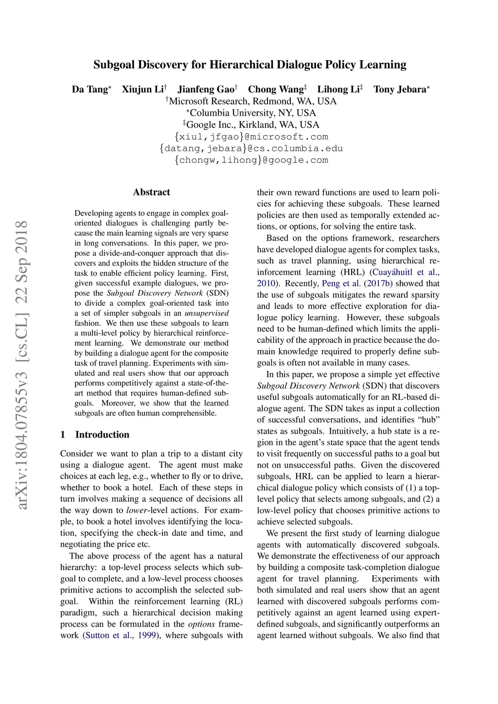 Developing agents to engage in complex goal-oriented dialogues is challenging partly because the main learning signals are very sparse in long conversations. In this paper, we propose a divide-and-conquer approach that discovers and exploits the hidden structure of the task to enable efficient policy learning. First, given successful example dialogues, we propose the Subgoal Discovery Network (SDN) to divide a complex goal-oriented task into a set of simpler subgoals in an unsupervised fashion. We then use these subgoals to learn a multi-level policy by hierarchical reinforcement learning. We demonstrate our method by building a dialogue agent for the composite task of travel planning. Experiments with simulated and real users show that our approach performs competitively against a state-of-the-art method that requires human-defined subgoals. Moreover, we show that the learned subgoals are often human comprehensible.