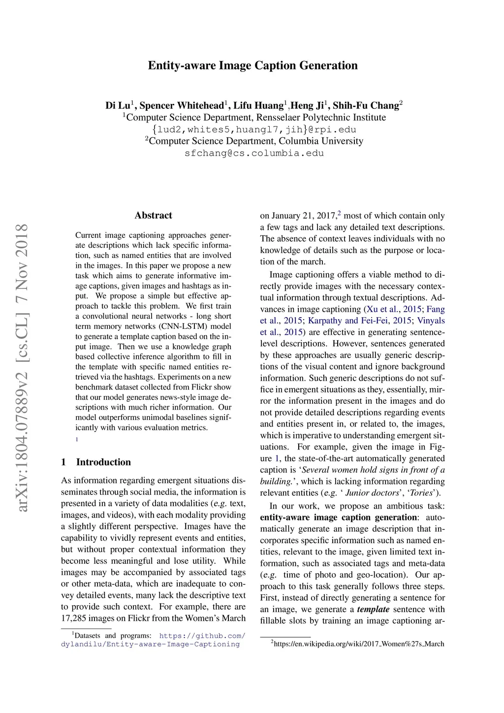 Current image captioning approaches generate descriptions which lack specific information, such as named entities that are involved in the images. In this paper we propose a new task which aims to generate informative image captions, given images and hashtags as input. We propose a simple but effective approach to tackle this problem. We first train a convolutional neural networks - long short term memory networks (CNN-LSTM) model to generate a template caption based on the input image. Then we use a knowledge graph based collective inference algorithm to fill in the template with specific named entities retrieved via the hashtags. Experiments on a new benchmark dataset collected from Flickr show that our model generates news-style image descriptions with much richer information. Our model outperforms unimodal baselines significantly with various evaluation metrics.