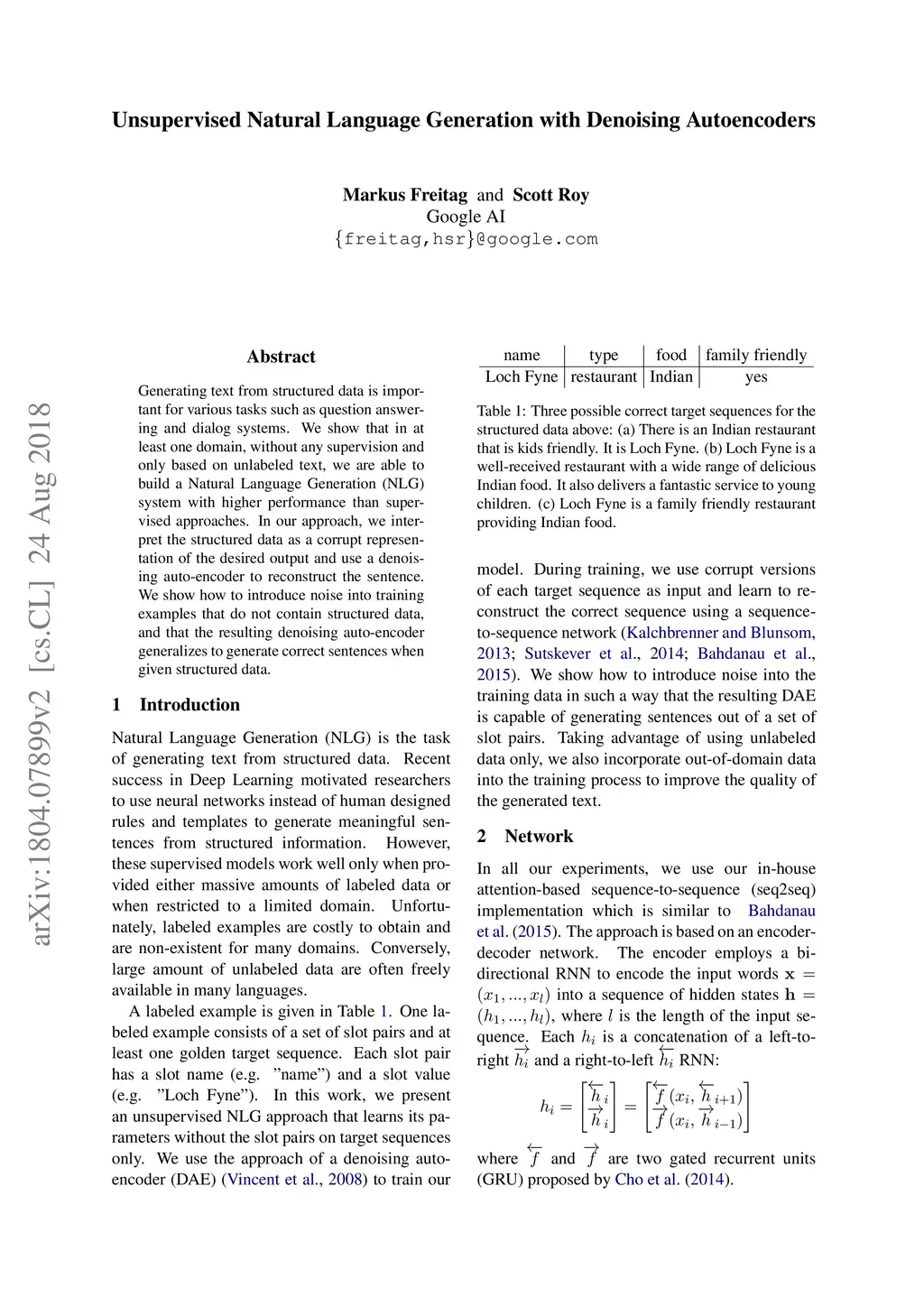 Unsupervised Natural Language Generation with Denoising Autoencoders