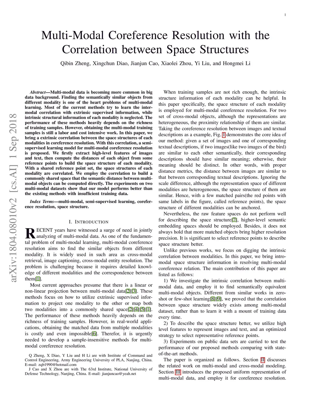 Multi-modal data is becoming more common in big data background. Finding the semantically similar objects from different modality is one of the heart problems of multi-modal learning. Most of the current methods try to learn the inter-modal correlation with extrinsic supervised information, while intrinsic structural information of each modality is neglected. The performance of these methods heavily depends on the richness of training samples. However, obtaining the multi-modal training samples is still a labor and cost intensive work. In this paper, we bring a extrinsic correlation between the space structures of each modalities in coreference resolution. With this correlation, a semi-supervised learning model for multi-modal coreference resolution is proposed. We firstly extract high-level features of images and text, then compute the distances of each object from some reference points to build the space structure of each modality. With a shared reference point set, the space structures of each modality are correlated. We employ the correlation to build a commonly shared space that the semantic distance between multi-modal objects can be computed directly. The experiments on two multi-modal datasets show that our model performs better than the existing methods with insufficient training data.