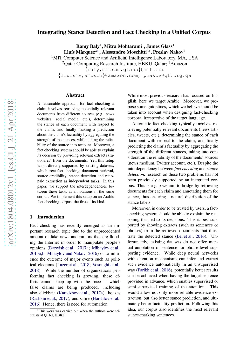 A reasonable approach for fact checking a claim involves retrieving potentially relevant documents from different sources (e.g., news websites, social media, etc.), determining the stance of each document with respect to the claim, and finally making a prediction about the claim's factuality by aggregating the strength of the stances, while taking the reliability of the source into account. Moreover, a fact checking system should be able to explain its decision by providing relevant extracts (rationales) from the documents. Yet, this setup is not directly supported by existing datasets, which treat fact checking, document retrieval, source credibility, stance detection and rationale extraction as independent tasks. In this paper, we support the interdependencies between these tasks as annotations in the same corpus. We implement this setup on an Arabic fact checking corpus, the first of its kind.
