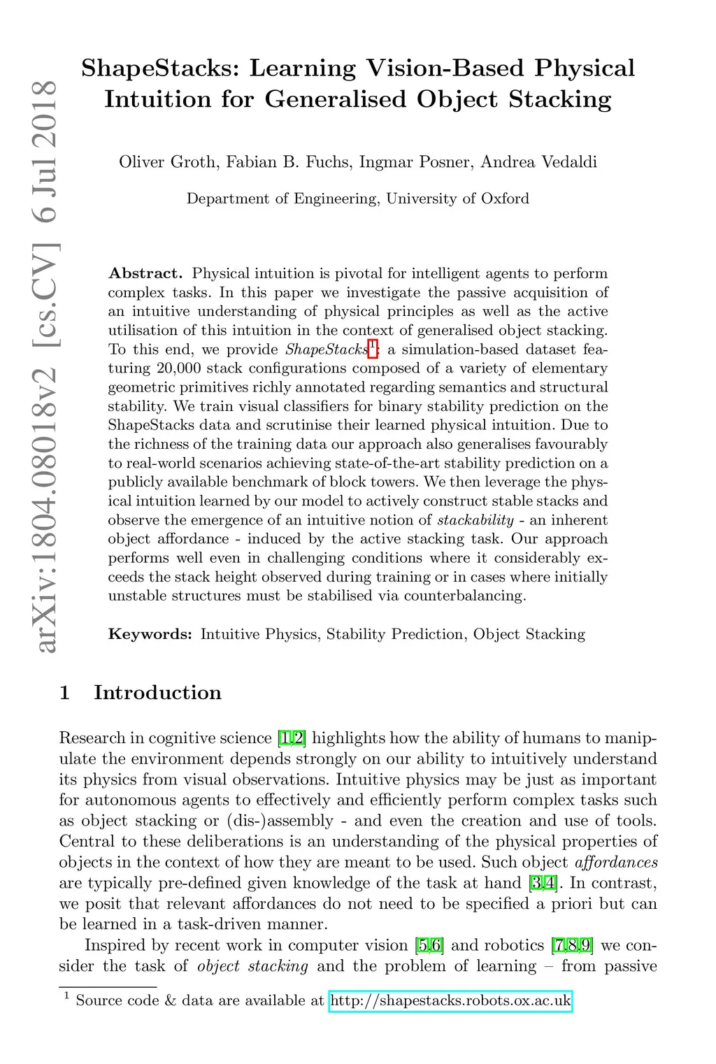 Physical intuition is pivotal for intelligent agents to perform complex tasks. In this paper we investigate the passive acquisition of an intuitive understanding of physical principles as well as the active utilisation of this intuition in the context of generalised object stacking. To this end, we provide: a simulation-based dataset featuring 20,000 stack configurations composed of a variety of elementary geometric primitives richly annotated regarding semantics and structural stability. We train visual classifiers for binary stability prediction on the ShapeStacks data and scrutinise their learned physical intuition. Due to the richness of the training data our approach also generalises favourably to real-world scenarios achieving state-of-the-art stability prediction on a publicly available benchmark of block towers. We then leverage the physical intuition learned by our model to actively construct stable stacks and observe the emergence of an intuitive notion of stackability - an inherent object affordance - induced by the active stacking task. Our approach performs well even in challenging conditions where it considerably exceeds the stack height observed during training or in cases where initially unstable structures must be stabilised via counterbalancing.