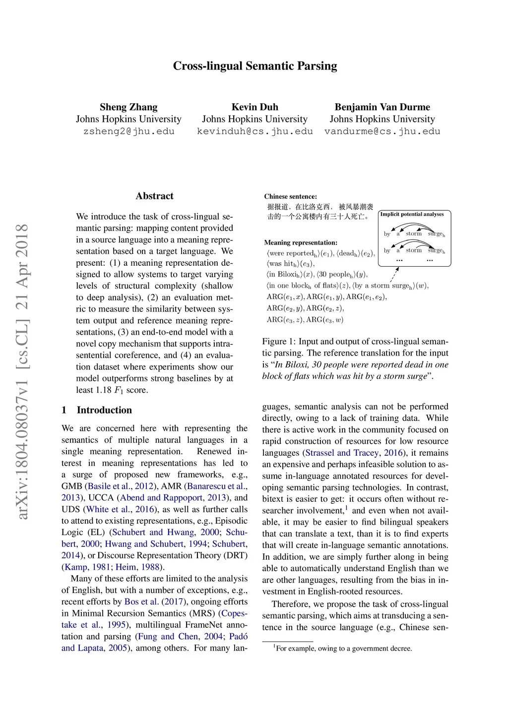 We introduce the task of cross-lingual semantic parsing: mapping content provided in a source language into a meaning representation based on a target language. We present: (1) a meaning representation designed to allow systems to target varying levels of structural complexity (shallow to deep analysis), (2) an evaluation metric to measure the similarity between system output and reference meaning representations, (3) an end-to-end model with a novel copy mechanism that supports intrasentential coreference, and (4) an evaluation dataset where experiments show our model outperforms strong baselines by at least 1.18 F1 score.