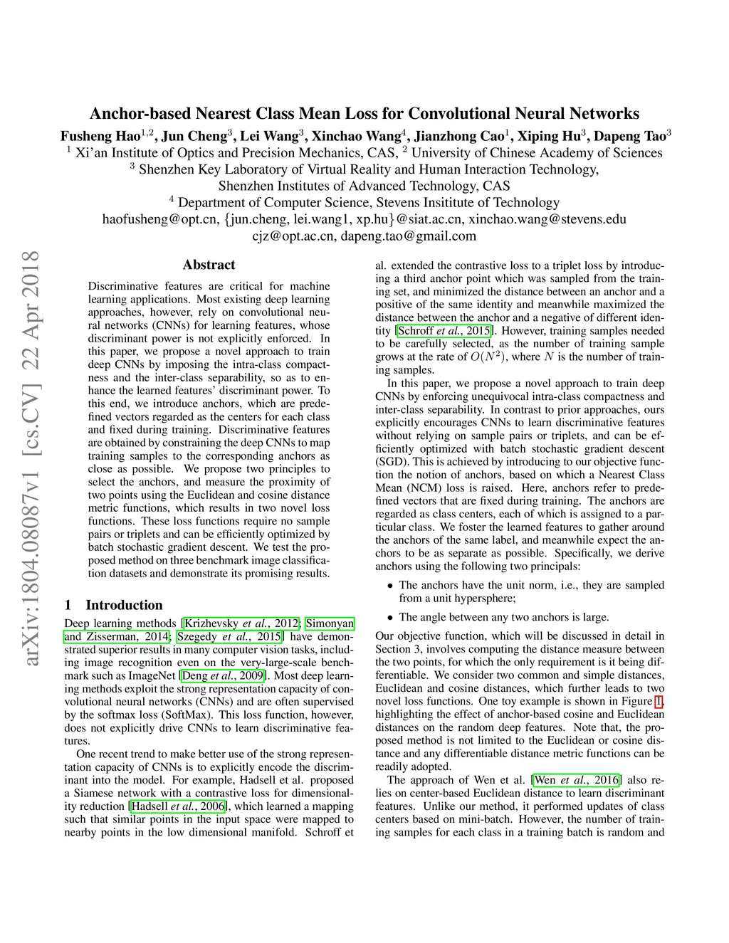 Discriminative features are critical for machine learning applications. Most existing deep learning approaches, however, rely on convolutional neural networks (CNNs) for learning features, whose discriminant power is not explicitly enforced. In this paper, we propose a novel approach to train deep CNNs by imposing the intra-class compactness and the inter-class separability, so as to enhance the learned features' discriminant power. To this end, we introduce anchors, which are predefined vectors regarded as the centers for each class and fixed during training. Discriminative features are obtained by constraining the deep CNNs to map training samples to the corresponding anchors as close as possible. We propose two principles to select the anchors, and measure the proximity of two points using the Euclidean and cosine distance metric functions, which results in two novel loss functions. These loss functions require no sample pairs or triplets and can be efficiently optimized by batch stochastic gradient descent. We test the proposed method on three benchmark image classification datasets and demonstrate its promising results.