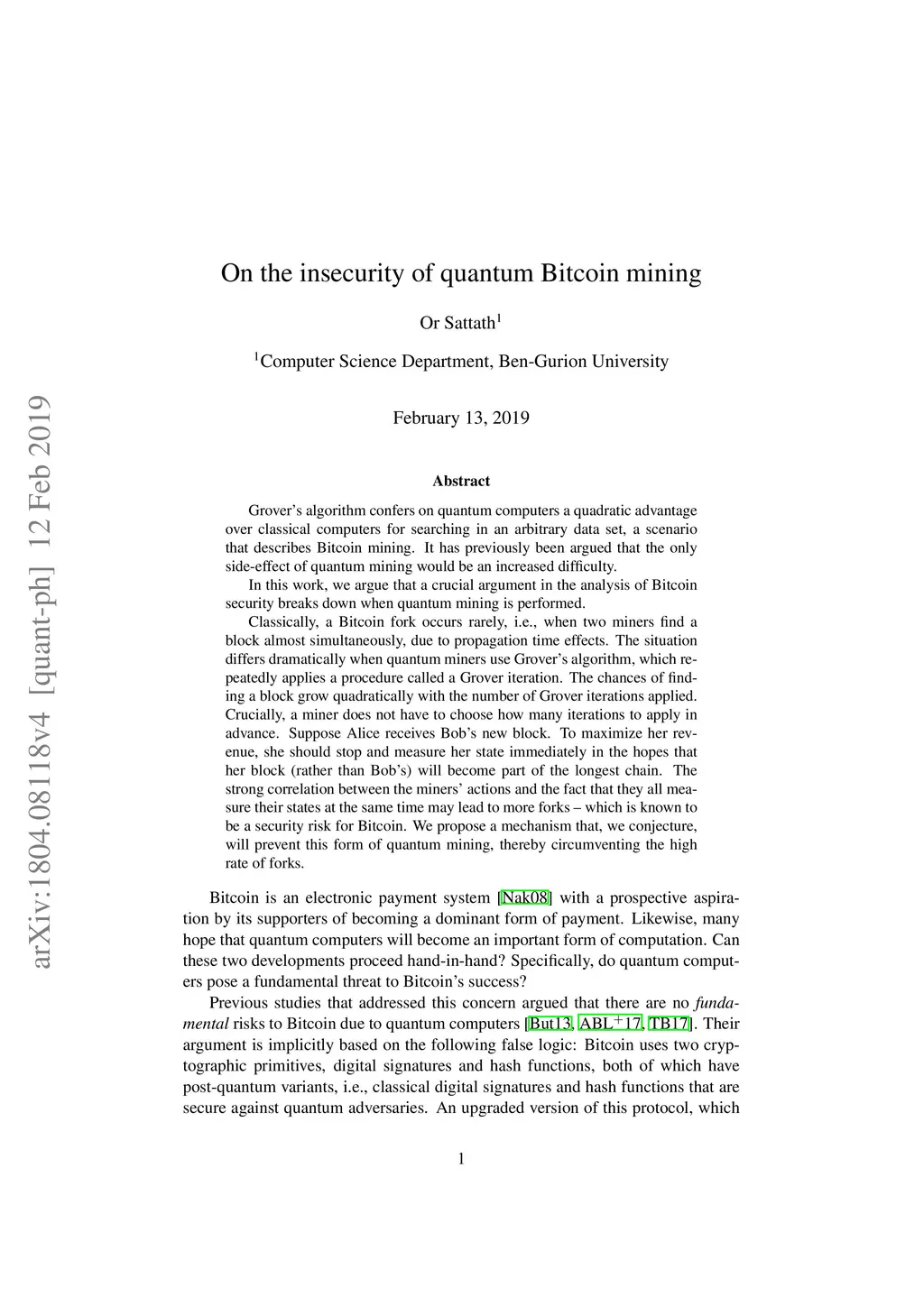 Grover's algorithm confers on quantum computers a quadratic advantage over classical computers for searching in an arbitrary data set, a scenario that describes Bitcoin mining. It has previously been argued that the only side-effect of quantum mining would be an increased difficulty. In this work, we argue that a crucial argument in the analysis of Bitcoin security breaks down when quantum mining is performed. Classically, a Bitcoin fork occurs rarely, i.e., when two miners find a block almost simultaneously, due to propagation time effects. The situation differs dramatically when quantum miners use Grover's algorithm, which repeatedly applies a procedure called a Grover iteration. The chances of finding a block grow quadratically with the number of Grover iterations applied. Crucially, a miner does not have to choose how many iterations to apply in advance. Suppose Alice receives Bob's new block. To maximize her revenue, she should stop and measure her state immediately in the hopes that her block (rather than Bob's) will become part of the longest chain. The strong correlation between the miners' actions and the fact that they all measure their states at the same time may lead to more forks -- which is known to be a security risk for Bitcoin. We propose a mechanism that, we conjecture, will prevent this form of quantum mining, thereby circumventing the high rate of forks.