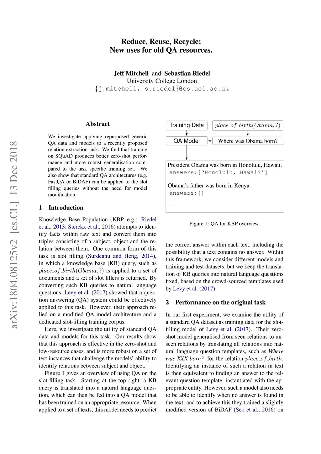 We investigate applying repurposed generic QA data and models to a recently proposed relation extraction task. We find that training on SQuAD produces better zero-shot performance and more robust generalisation compared to the task specific training set. We also show that standard QA architectures (e.g. FastQA or BiDAF) can be applied to the slot filling queries without the need for model modification.