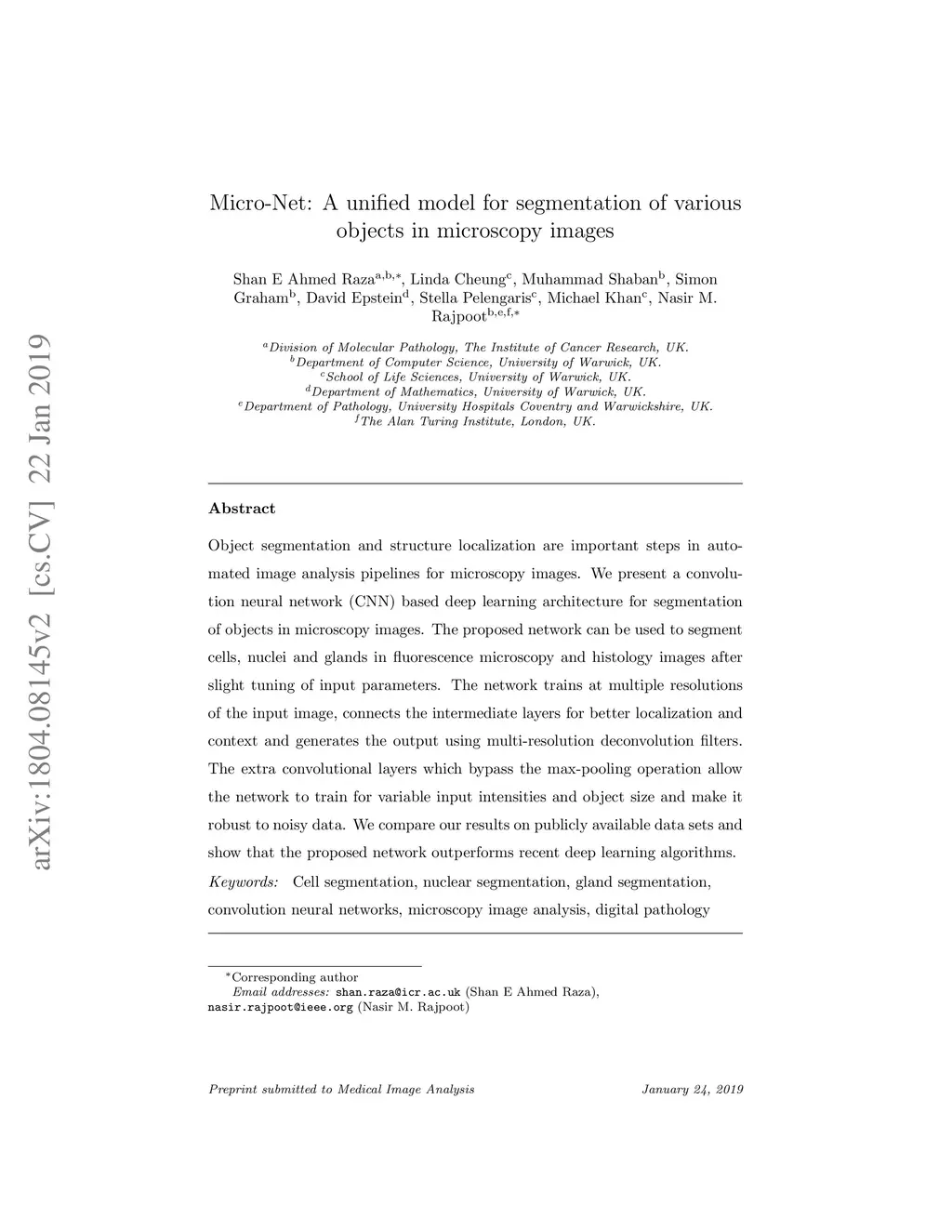 Object segmentation and structure localization are important steps in automated image analysis pipelines for microscopy images. We present a convolution neural network (CNN) based deep learning architecture for segmentation of objects in microscopy images. The proposed network can be used to segment cells, nuclei and glands in fluorescence microscopy and histology images after slight tuning of input parameters. The network trains at multiple resolutions of the input image, connects the intermediate layers for better localization and context and generates the output using multi-resolution deconvolution filters. The extra convolutional layers which bypass the max-pooling operation allow the network to train for variable input intensities and object size and make it robust to noisy data. We compare our results on publicly available data sets and show that the proposed network outperforms recent deep learning algorithms.