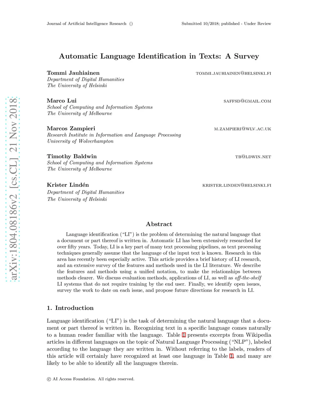 Automatic Language Identification in Texts: A Survey