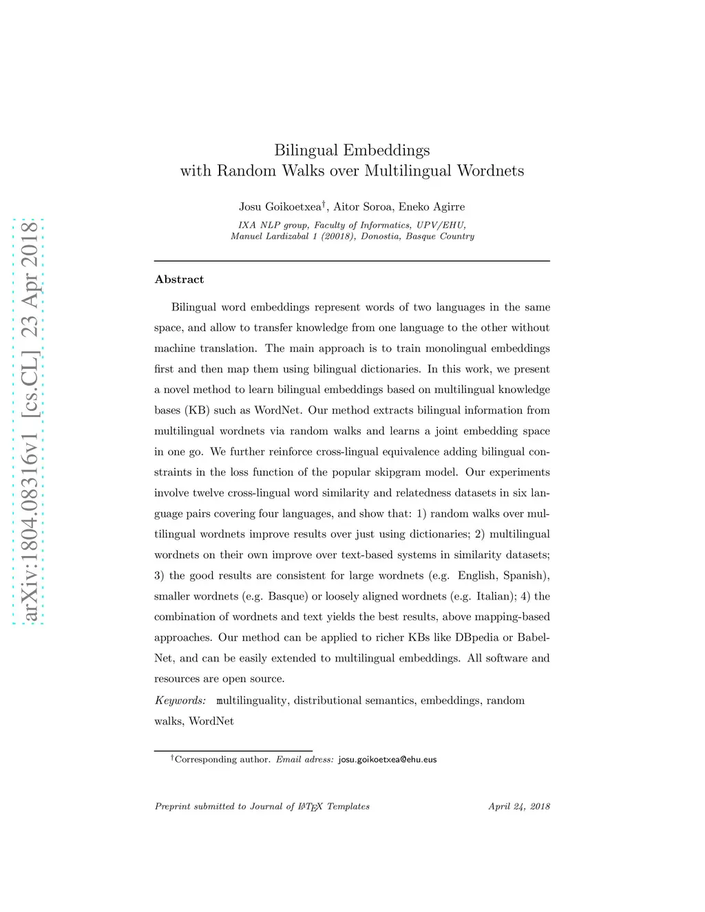 Bilingual Embeddings with Random Walks over Multilingual Wordnets
