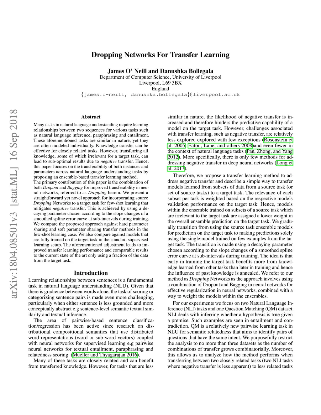 Many tasks in natural language understanding require learning relationships between two sequences for various tasks such as natural language inference, paraphrasing and entailment. These aforementioned tasks are similar in nature, yet they are often modeled individually. Knowledge transfer can be effective for closely related tasks. However, transferring all knowledge, some of which irrelevant for a target task, can lead to sub-optimal results due to \textit{negative} transfer. Hence, this paper focuses on the transferability of both instances and parameters across natural language understanding tasks by proposing an ensemble-based transfer learning method. \newline The primary contribution of this paper is the combination of both \textit{Dropout} and \textit{Bagging} for improved transferability in neural networks, referred to as \textit{Dropping} herein. We present a straightforward yet novel approach for incorporating source \textit{Dropping} Networks to a target task for few-shot learning that mitigates \textit{negative} transfer. This is achieved by using a decaying parameter chosen according to the slope changes of a smoothed spline error curve at sub-intervals during training. We compare the proposed approach against hard parameter sharing and soft parameter sharing transfer methods in the few-shot learning case. We also compare against models that are fully trained on the target task in the standard supervised learning setup. The aforementioned adjustment leads to improved transfer learning performance and comparable results to the current state of the art only using a fraction of the data from the target task.