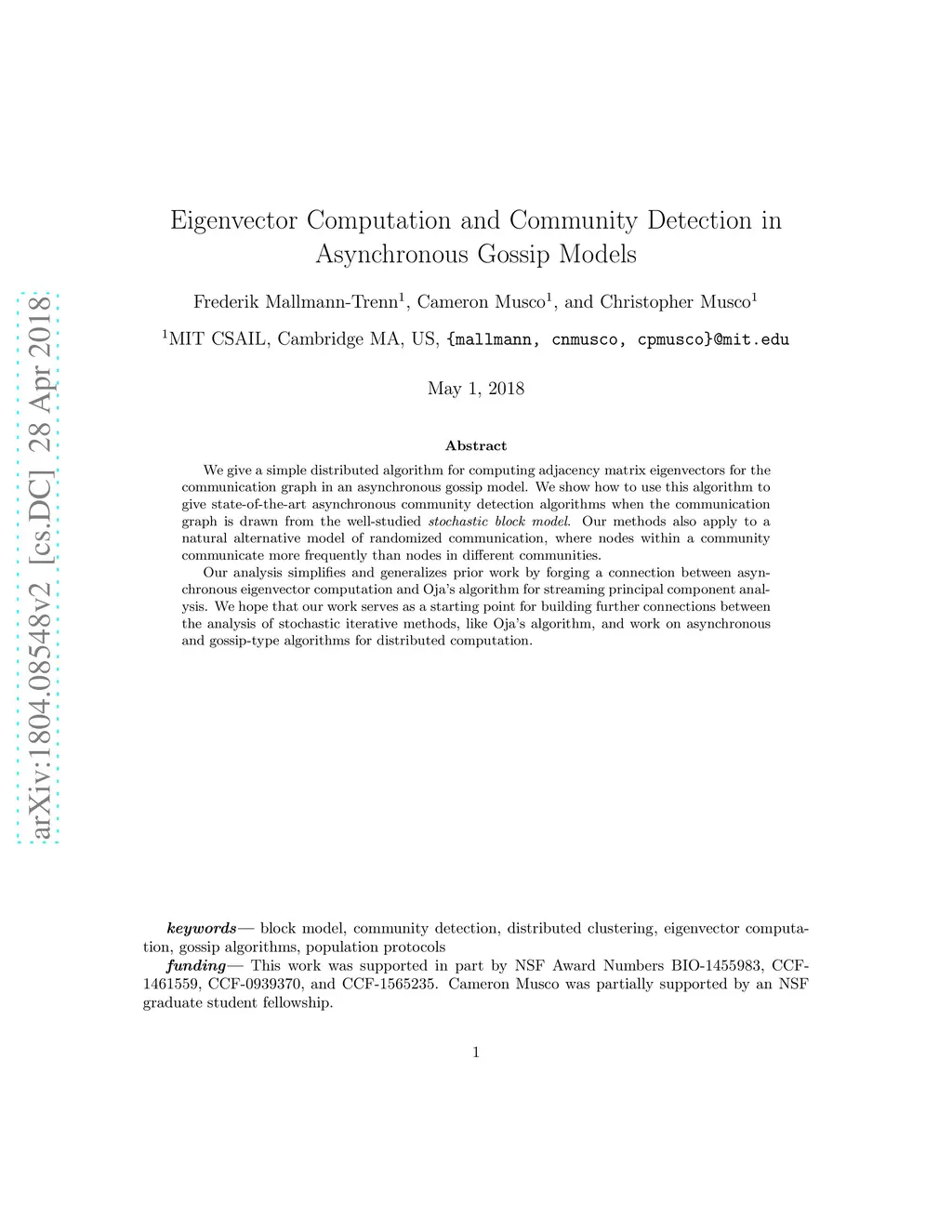 We give a simple distributed algorithm for computing adjacency matrix eigenvectors for the communication graph in an asynchronous gossip model. We show how to use this algorithm to give state-of-the-art asynchronous community detection algorithms when the communication graph is drawn from the well-studied stochastic block model. Our methods also apply to a natural alternative model of randomized communication, where nodes within a community communicate more frequently than nodes in different communities. Our analysis simplifies and generalizes prior work by forging a connection between asynchronous eigenvector computation and Oja's algorithm for streaming principal component analysis. We hope that our work serves as a starting point for building further connections between the analysis of stochastic iterative methods, like Oja's algorithm, and work on asynchronous and gossip-type algorithms for distributed computation.