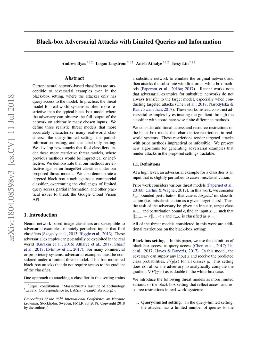 Current neural network-based classifiers are susceptible to adversarial examples even in the black-box setting, where the attacker only has query access to the model. In practice, the threat model for real-world systems is often more restrictive than the typical black-box model where the adversary can observe the full output of the network on arbitrarily many chosen inputs. We define three realistic threat models that more accurately characterize many real-world classifiers: the query-limited setting, the partial-information setting, and the label-only setting. We develop new attacks that fool classifiers under these more restrictive threat models, where previous methods would be impractical or ineffective. We demonstrate that our methods are effective against an ImageNet classifier under our proposed threat models. We also demonstrate a targeted black-box attack against a commercial classifier, overcoming the challenges of limited query access, partial information, and other practical issues to break the Google Cloud Vision API.