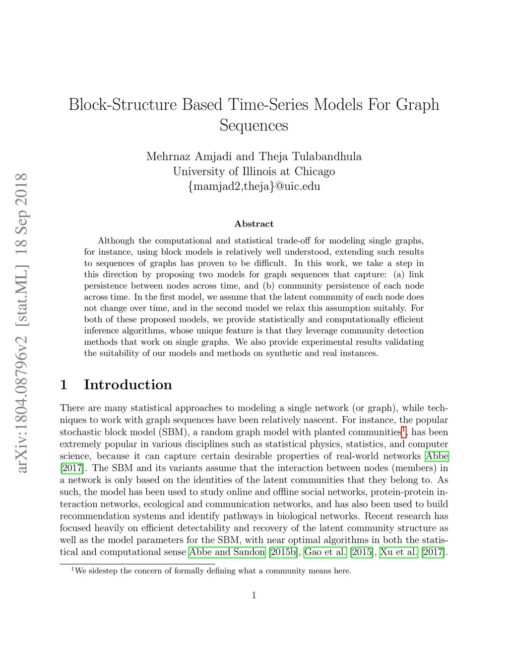 Although the computational and statistical trade-off for modeling single graphs, for instance, using block models is relatively well understood, extending such results to sequences of graphs has proven to be difficult. In this work, we take a step in this direction by proposing two models for graph sequences that capture: (a) link persistence between nodes across time, and (b) community persistence of each node across time. In the first model, we assume that the latent community of each node does not change over time, and in the second model we relax this assumption suitably. For both of these proposed models, we provide statistically and computationally efficient inference algorithms, whose unique feature is that they leverage community detection methods that work on single graphs. We also provide experimental results validating the suitability of our models and methods on synthetic and real instances.