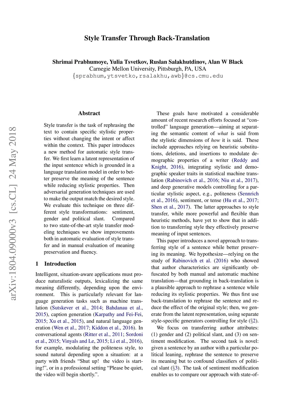 Style transfer is the task of rephrasing the text to contain specific stylistic properties without changing the intent or affect within the context. This paper introduces a new method for automatic style transfer. We first learn a latent representation of the input sentence which is grounded in a language translation model in order to better preserve the meaning of the sentence while reducing stylistic properties. Then adversarial generation techniques are used to make the output match the desired style. We evaluate this technique on three different style transformations: sentiment, gender and political slant. Compared to two state-of-the-art style transfer modeling techniques we show improvements both in automatic evaluation of style transfer and in manual evaluation of meaning preservation and fluency.