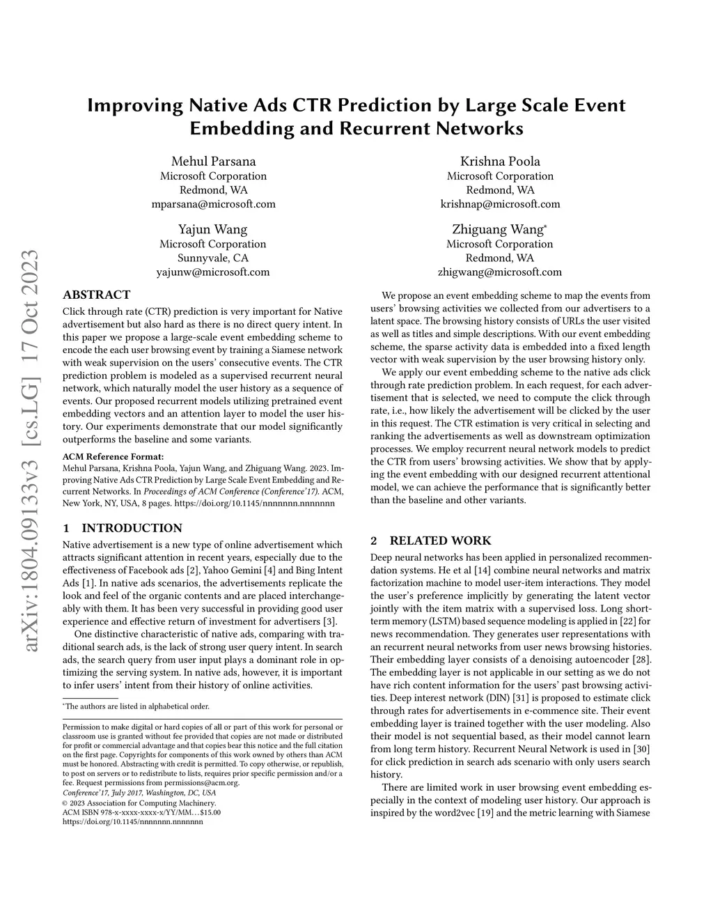 Click through rate (CTR) prediction is very important for Native advertisement but also hard as there is no direct query intent. In this paper we propose a large-scale event embedding scheme to encode the each user browsing event by training a Siamese network with weak supervision on the users' consecutive events. The CTR prediction problem is modeled as a supervised recurrent neural network, which naturally model the user history as a sequence of events. Our proposed recurrent models utilizing pretrained event embedding vectors and an attention layer to model the user history. Our experiments demonstrate that our model significantly outperforms the baseline and some variants.
