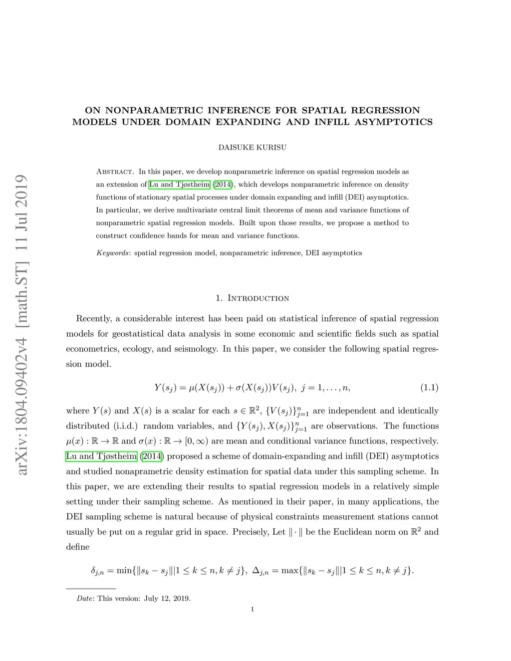In this paper, we develop nonparametric inference on spatial regression models as an extension of Lu and Tj{\o}stheim (2014), which develops nonparametric inference on density functions of stationary spatial processes under domain expanding and infill (DEI) asymptotics. In particular, we derive multivariate central limit theorems of mean and variance functions of nonparametric spatial regression models. Build upon those results, we propose a method to construct confidence bands for mean and variance functions. We also propose a practical method for bandwidth selection.