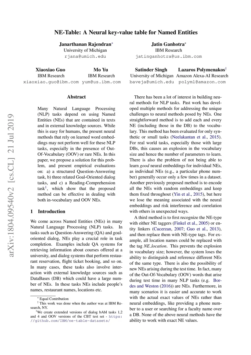 Many Natural Language Processing (NLP) tasks depend on using Named Entities (NEs) that are contained in texts and in external knowledge sources. While this is easy for humans, the present neural methods that rely on learned word embeddings may not perform well for these NLP tasks, especially in the presence of Out-Of-Vocabulary (OOV) or rare NEs. In this paper, we propose a solution for this problem, and present empirical evaluations on: a) a structured Question-Answering task, b) three related Goal-Oriented dialog tasks, and c) a Reading-Comprehension task, which show that the proposed method can be effective in dealing with both in-vocabulary and OOV NEs. We create extended versions of dialog bAbI tasks 1,2 and 4 and OOV versions of the CBT test set available at - https://github.com/IBM/ne-table-datasets.