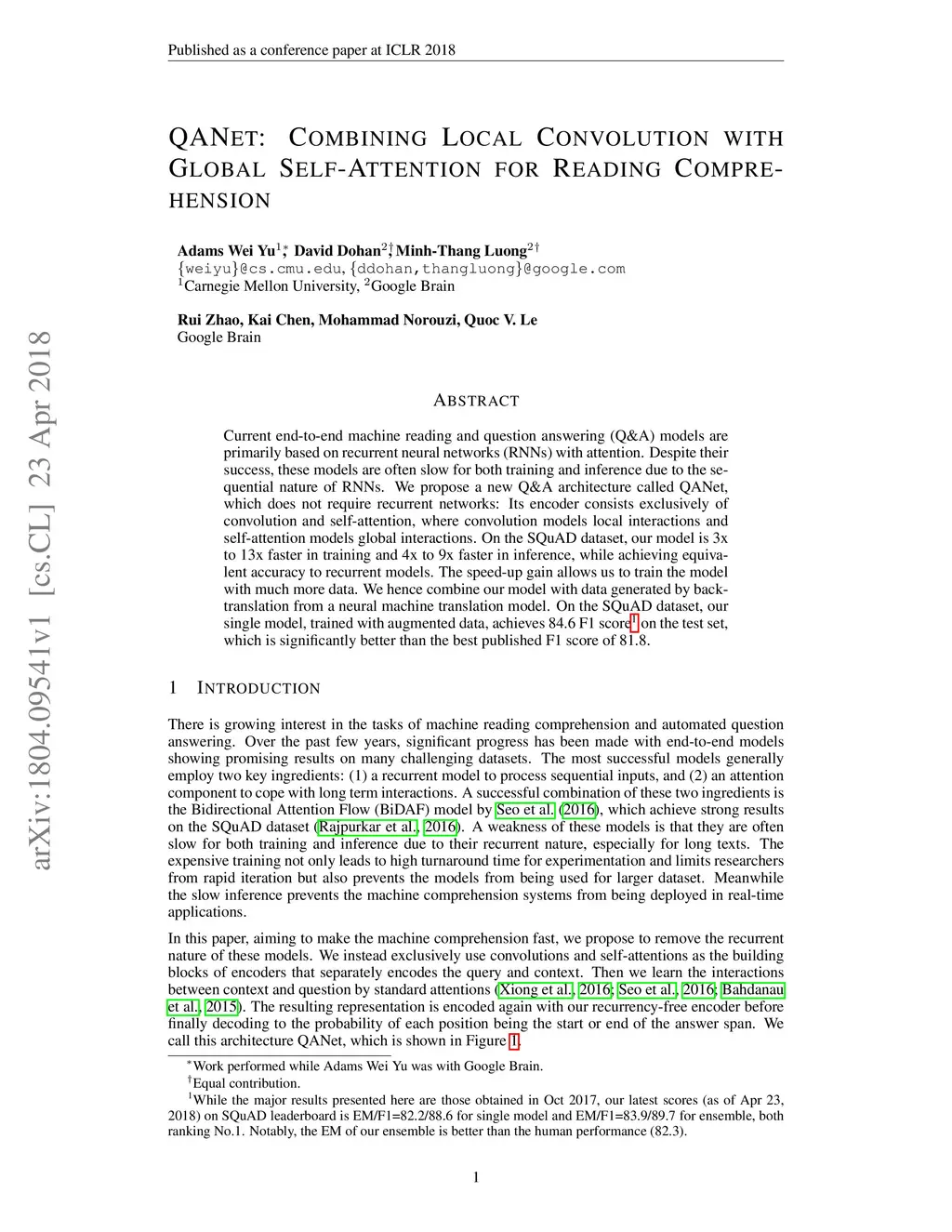 QANet: Combining Local Convolution with Global Self-Attention for