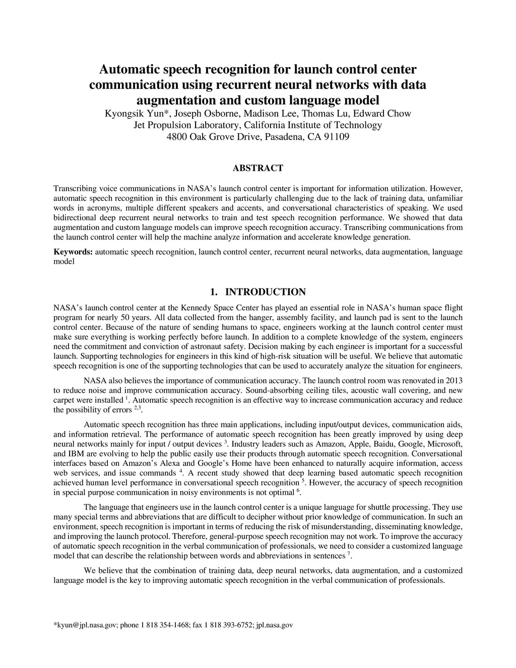 Transcribing voice communications in NASA's launch control center is important for information utilization. However, automatic speech recognition in this environment is particularly challenging due to the lack of training data, unfamiliar words in acronyms, multiple different speakers and accents, and conversational characteristics of speaking. We used bidirectional deep recurrent neural networks to train and test speech recognition performance. We showed that data augmentation and custom language models can improve speech recognition accuracy. Transcribing communications from the launch control center will help the machine analyze information and accelerate knowledge generation.
