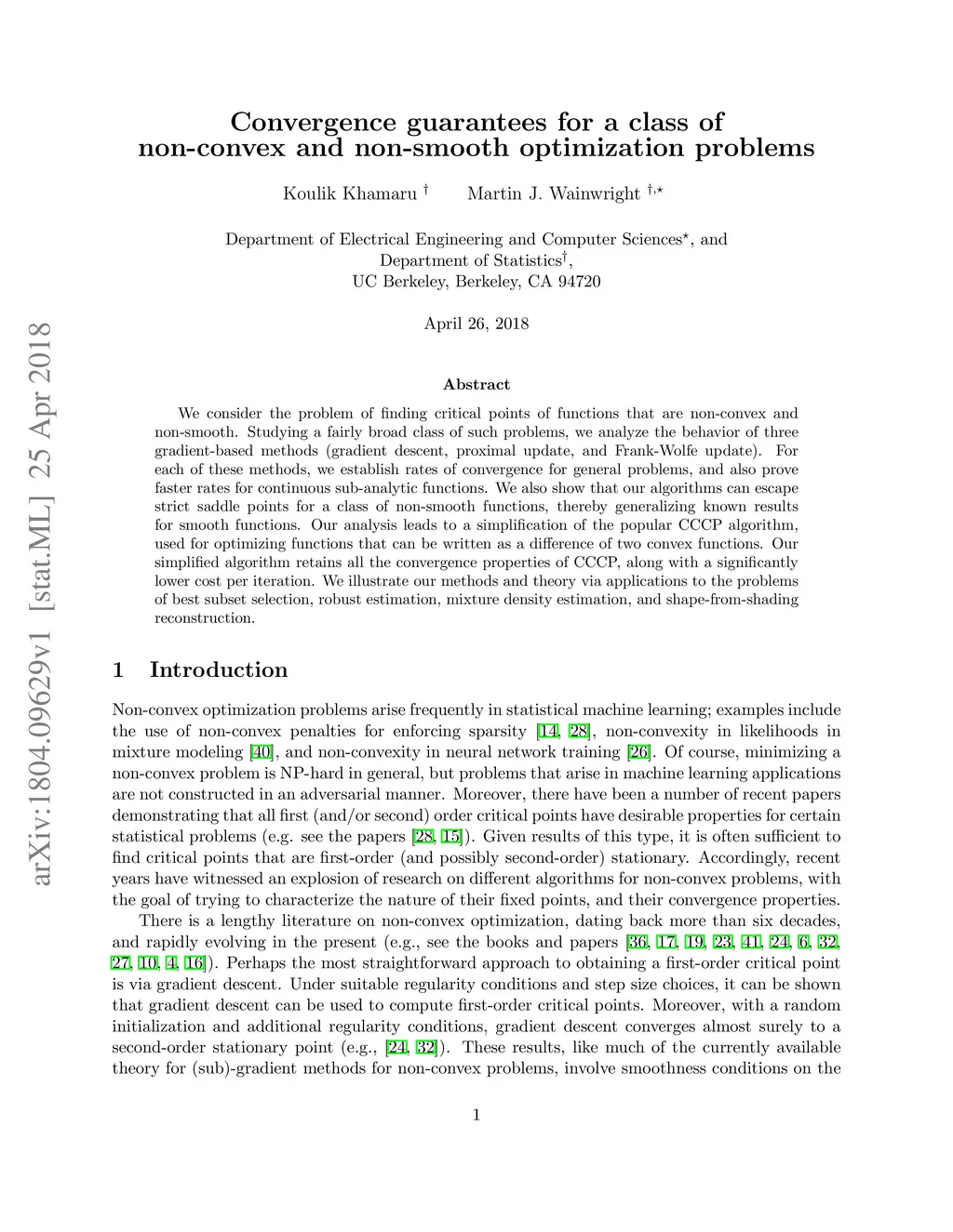 We consider the problem of finding critical points of functions that are non-convex and non-smooth. Studying a fairly broad class of such problems, we analyze the behavior of three gradient-based methods (gradient descent, proximal update, and Frank-Wolfe update). For each of these methods, we establish rates of convergence for general problems, and also prove faster rates for continuous sub-analytic functions. We also show that our algorithms can escape strict saddle points for a class of non-smooth functions, thereby generalizing known results for smooth functions. Our analysis leads to a simplification of the popular CCCP algorithm, used for optimizing functions that can be written as a difference of two convex functions. Our simplified algorithm retains all the convergence properties of CCCP, along with a significantly lower cost per iteration. We illustrate our methods and theory via applications to the problems of best subset selection, robust estimation, mixture density estimation, and shape-from-shading reconstruction.