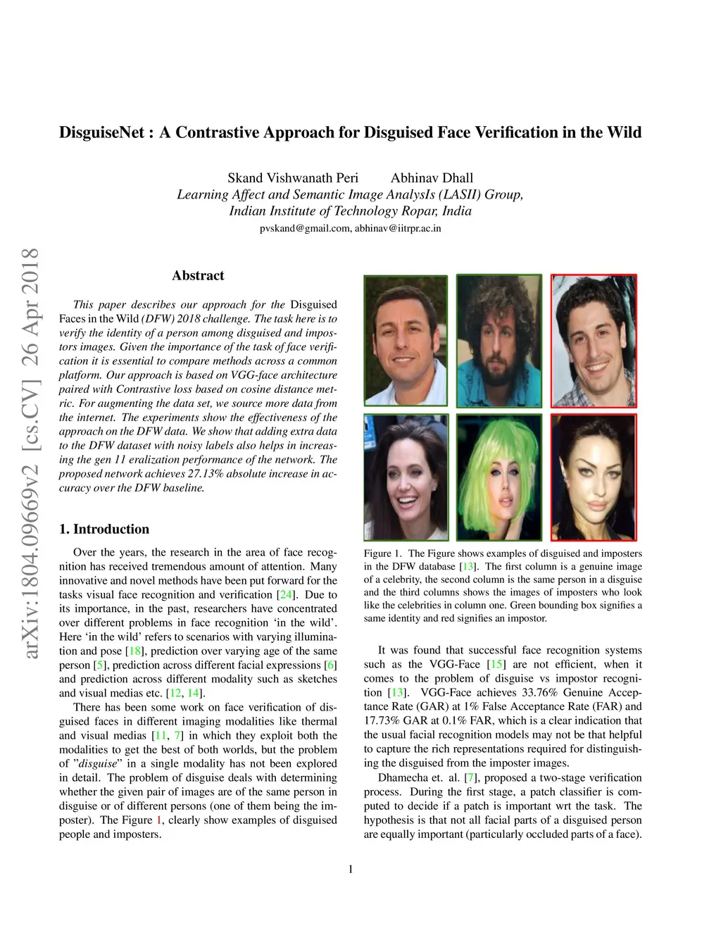 This paper describes our approach for the Disguised Faces in the Wild (DFW) 2018 challenge. The task here is to verify the identity of a person among disguised and impostors images. Given the importance of the task of face verification it is essential to compare methods across a common platform. Our approach is based on VGG-face architecture paired with Contrastive loss based on cosine distance metric. For augmenting the data set, we source more data from the internet. The experiments show the effectiveness of the approach on the DFW data. We show that adding extra data to the DFW dataset with noisy labels also helps in increasing the generalization performance of the network. The proposed network achieves 27.13% absolute increase in accuracy over the DFW baseline.