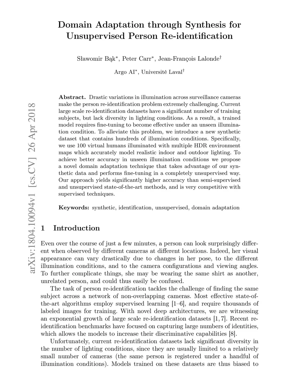 Drastic variations in illumination across surveillance cameras make the person re-identification problem extremely challenging. Current large scale re-identification datasets have a significant number of training subjects, but lack diversity in lighting conditions. As a result, a trained model requires fine-tuning to become effective under an unseen illumination condition. To alleviate this problem, we introduce a new synthetic dataset that contains hundreds of illumination conditions. Specifically, we use 100 virtual humans illuminated with multiple HDR environment maps which accurately model realistic indoor and outdoor lighting. To achieve better accuracy in unseen illumination conditions we propose a novel domain adaptation technique that takes advantage of our synthetic data and performs fine-tuning in a completely unsupervised way. Our approach yields significantly higher accuracy than semi-supervised and unsupervised state-of-the-art methods, and is very competitive with supervised techniques.