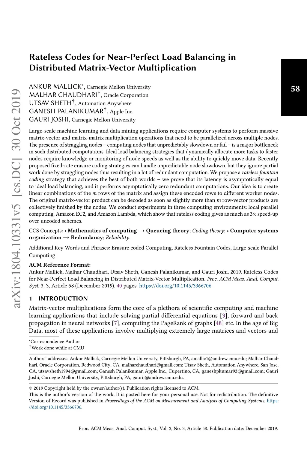 Large-scale machine learning and data mining applications require computer systems to perform massive matrix-vector and matrix-matrix multiplication operations that need to be parallelized across multiple nodes. The presence of straggling nodes -- computing nodes that unpredictably slowdown or fail -- is a major bottleneck in such distributed computations. Ideal load balancing strategies that dynamically allocate more tasks to faster nodes require knowledge or monitoring of node speeds as well as the ability to quickly move data. Recently proposed fixed-rate erasure coding strategies can handle unpredictable node slowdown, but they ignore partial work done by straggling nodes thus resulting in a lot of redundant computation. We propose a \emph{rateless fountain coding} strategy that achieves the best of both worlds -- we prove that its latency is asymptotically equal to ideal load balancing, and it performs asymptotically zero redundant computations. Our idea is to create linear combinations of the rows of the matrix and assign these encoded rows to different worker nodes. The original matrix-vector product can be decoded as soon as slightly more than row-vector products are collectively finished by the nodes. We conduct experiments in three computing environments: local parallel computing, Amazon EC2, and Amazon Lambda, which show that rateless coding gives as much as speed-up over uncoded schemes.