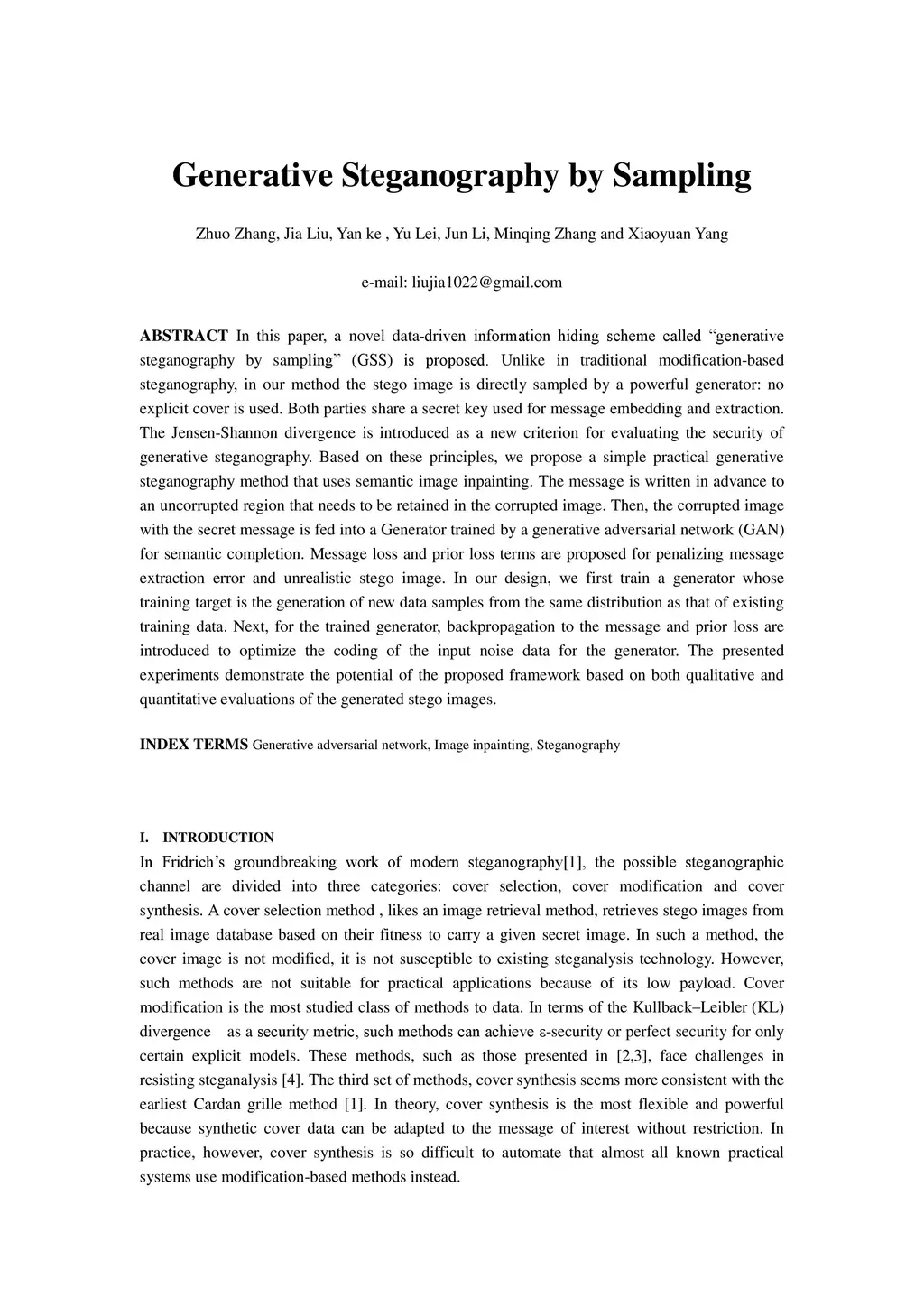 In this paper, a novel data-driven information hiding scheme called generative steganography by sampling (GSS) is proposed. Unlike in traditional modification-based steganography, in our method the stego image is directly sampled by a powerful generator: no explicit cover is used. Both parties share a secret key used for message embedding and extraction. The Jensen-Shannon divergence is introduced as a new criterion for evaluating the security of generative steganography. Based on these principles, we propose a simple practical generative steganography method that uses semantic image inpainting. The message is written in advance to an uncorrupted region that needs to be retained in the corrupted image. Then, the corrupted image with the secret message is fed into a Generator trained by a generative adversarial network (GAN) for semantic completion. Message loss and prior loss terms are proposed for penalizing message extraction error and unrealistic stego image. In our design, we first train a generator whose training target is the generation of new data samples from the same distribution as that of existing training data. Next, for the trained generator, backpropagation to the message and prior loss are introduced to optimize the coding of the input noise data for the generator. The presented experiments demonstrate the potential of the proposed framework based on both qualitative and quantitative evaluations of the generated stego images.