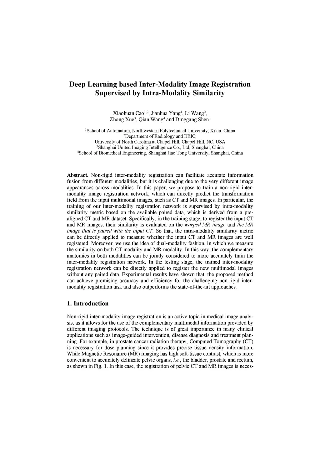Non-rigid inter-modality registration can facilitate accurate information fusion from different modalities, but it is challenging due to the very different image appearances across modalities. In this paper, we propose to train a non-rigid inter-modality image registration network, which can directly predict the transformation field from the input multimodal images, such as CT and MR images. In particular, the training of our inter-modality registration network is supervised by intra-modality similarity metric based on the available paired data, which is derived from a pre-aligned CT and MR dataset. Specifically, in the training stage, to register the input CT and MR images, their similarity is evaluated on the warped MR image and the MR image that is paired with the input CT. So that, the intra-modality similarity metric can be directly applied to measure whether the input CT and MR images are well registered. Moreover, we use the idea of dual-modality fashion, in which we measure the similarity on both CT modality and MR modality. In this way, the complementary anatomies in both modalities can be jointly considered to more accurately train the inter-modality registration network. In the testing stage, the trained inter-modality registration network can be directly applied to register the new multimodal images without any paired data. Experimental results have shown that, the proposed method can achieve promising accuracy and efficiency for the challenging non-rigid inter-modality registration task and also outperforms the state-of-the-art approaches.