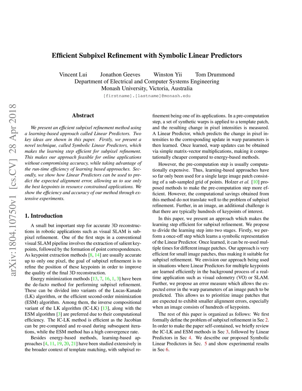We present an efficient subpixel refinement method usinga learning-based approach called Linear Predictors. Two key ideas are shown in this paper. Firstly, we present a novel technique, called Symbolic Linear Predictors, which makes the learning step efficient for subpixel refinement. This makes our approach feasible for online applications without compromising accuracy, while taking advantage of the run-time efficiency of learning based approaches. Secondly, we show how Linear Predictors can be used to predict the expected alignment error, allowing us to use only the best keypoints in resource constrained applications. We show the efficiency and accuracy of our method through extensive experiments.