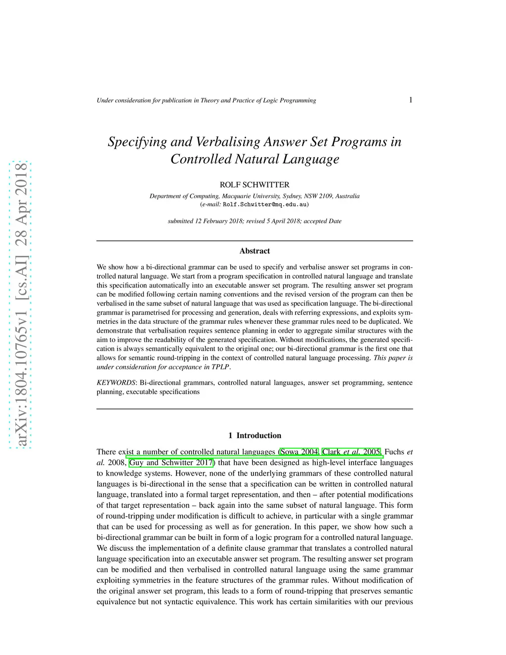 We show how a bi-directional grammar can be used to specify and verbalise answer set programs in controlled natural language. We start from a program specification in controlled natural language and translate this specification automatically into an executable answer set program. The resulting answer set program can be modified following certain naming conventions and the revised version of the program can then be verbalised in the same subset of natural language that was used as specification language. The bi-directional grammar is parametrised for processing and generation, deals with referring expressions, and exploits symmetries in the data structure of the grammar rules whenever these grammar rules need to be duplicated. We demonstrate that verbalisation requires sentence planning in order to aggregate similar structures with the aim to improve the readability of the generated specification. Without modifications, the generated specification is always semantically equivalent to the original one; our bi-directional grammar is the first one that allows for semantic round-tripping in the context of controlled natural language processing. This paper is under consideration for acceptance in TPLP.