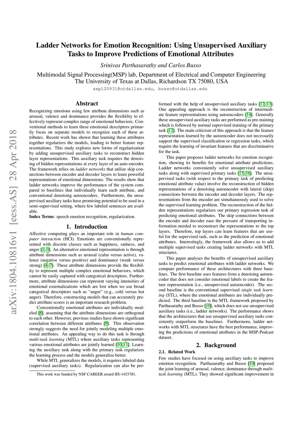 Recognizing emotions using few attribute dimensions such as arousal, valence and dominance provides the flexibility to effectively represent complex range of emotional behaviors. Conventional methods to learn these emotional descriptors primarily focus on separate models to recognize each of these attributes. Recent work has shown that learning these attributes together regularizes the models, leading to better feature representations. This study explores new forms of regularization by adding unsupervised auxiliary tasks to reconstruct hidden layer representations. This auxiliary task requires the denoising of hidden representations at every layer of an auto-encoder. The framework relies on ladder networks that utilize skip connections between encoder and decoder layers to learn powerful representations of emotional dimensions. The results show that ladder networks improve the performance of the system compared to baselines that individually learn each attribute, and conventional denoising autoencoders. Furthermore, the unsupervised auxiliary tasks have promising potential to be used in a semi-supervised setting, where few labeled sentences are available.