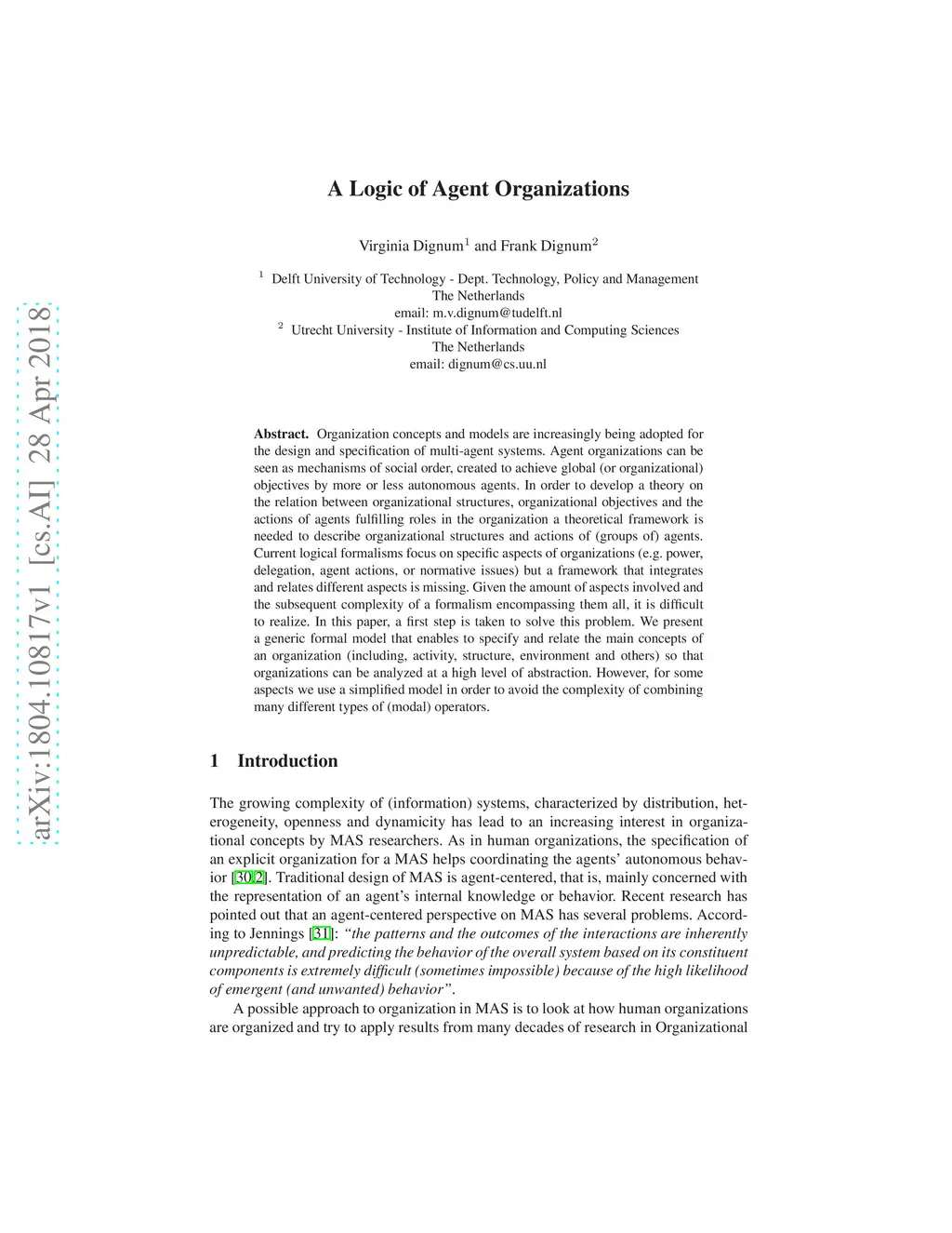 Organization concepts and models are increasingly being adopted for the design and specification of multi-agent systems. Agent organizations can be seen as mechanisms of social order, created to achieve global (or organizational) objectives by more or less autonomous agents. In order to develop a theory on the relation between organizational structures, organizational objectives and the actions of agents fulfilling roles in the organization a theoretical framework is needed to describe organizational structures and actions of (groups of) agents. Current logical formalisms focus on specific aspects of organizations (e.g. power, delegation, agent actions, or normative issues) but a framework that integrates and relates different aspects is missing. Given the amount of aspects involved and the subsequent complexity of a formalism encompassing them all, it is difficult to realize. In this paper, a first step is taken to solve this problem. We present a generic formal model that enables to specify and relate the main concepts of an organization (including, activity, structure, environment and others) so that organizations can be analyzed at a high level of abstraction. However, for some aspects we use a simplified model in order to avoid the complexity of combining many different types of (modal) operators.