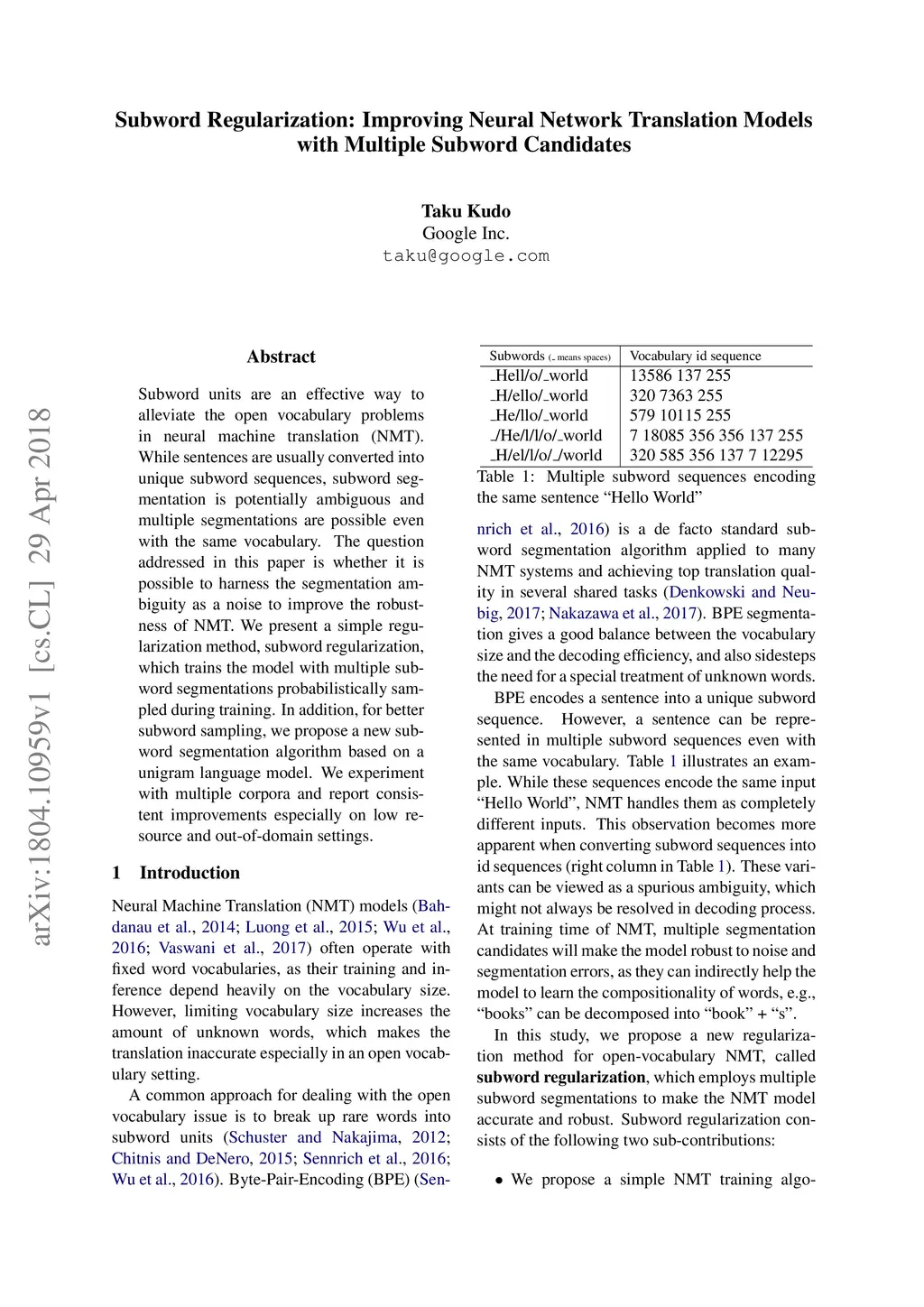 Subword units are an effective way to alleviate the open vocabulary problems in neural machine translation (NMT). While sentences are usually converted into unique subword sequences, subword segmentation is potentially ambiguous and multiple segmentations are possible even with the same vocabulary. The question addressed in this paper is whether it is possible to harness the segmentation ambiguity as a noise to improve the robustness of NMT. We present a simple regularization method, subword regularization, which trains the model with multiple subword segmentations probabilistically sampled during training. In addition, for better subword sampling, we propose a new subword segmentation algorithm based on a unigram language model. We experiment with multiple corpora and report consistent improvements especially on low resource and out-of-domain settings.