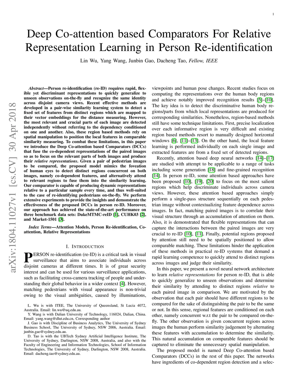 Person re-identification (re-ID) requires rapid, flexible yet discriminant representations to quickly generalize to unseen observations on-the-fly and recognize the same identity across disjoint camera views. Recent effective methods are developed in a pair-wise similarity learning system to detect a fixed set of features from distinct regions which are mapped to their vector embeddings for the distance measuring. However, the most relevant and crucial parts of each image are detected independently without referring to the dependency conditioned on one and another. Also, these region based methods rely on spatial manipulation to position the local features in comparable similarity measuring. To combat these limitations, in this paper we introduce the Deep Co-attention based Comparators (DCCs) that fuse the co-dependent representations of the paired images so as to focus on the relevant parts of both images and produce their \textit{relative representations}. Given a pair of pedestrian images to be compared, the proposed model mimics the foveation of human eyes to detect distinct regions concurrent on both images, namely co-dependent features, and alternatively attend to relevant regions to fuse them into the similarity learning. Our comparator is capable of producing dynamic representations relative to a particular sample every time, and thus well-suited to the case of re-identifying pedestrians on-the-fly. We perform extensive experiments to provide the insights and demonstrate the effectiveness of the proposed DCCs in person re-ID. Moreover, our approach has achieved the state-of-the-art performance on three benchmark data sets: DukeMTMC-reID \cite{DukeMTMC}, CUHK03 \cite{FPNN}, and Market-1501 \cite{Market1501}.