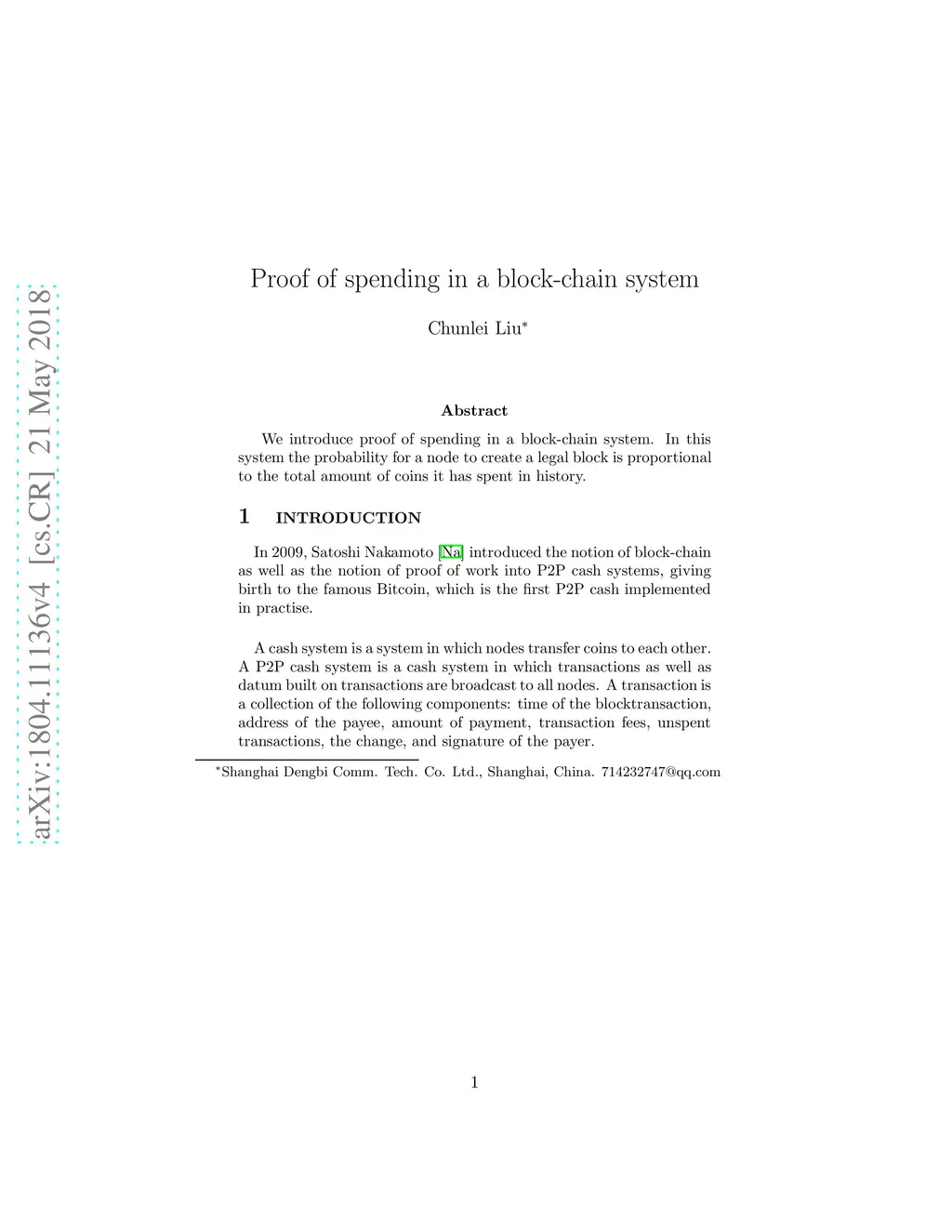 We introduce proof of spending in a block-chain system. In this system the probability for a node to create a legal block is proportional to the total amount of coins it has spent in history.