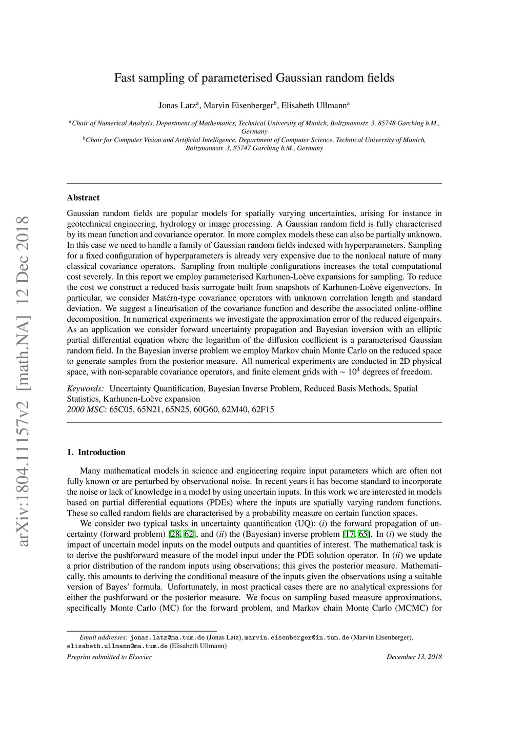 Gaussian random fields are popular models for spatially varying uncertainties, arising for instance in geotechnical engineering, hydrology or image processing. A Gaussian random field is fully characterised by its mean function and covariance operator. In more complex models these can also be partially unknown. In this case we need to handle a family of Gaussian random fields indexed with hyperparameters. Sampling for a fixed configuration of hyperparameters is already very expensive due to the nonlocal nature of many classical covariance operators. Sampling from multiple configurations increases the total computational cost severely. In this report we employ parameterised Karhunen-Lo\`eve expansions for sampling. To reduce the cost we construct a reduced basis surrogate built from snapshots of Karhunen-Lo\`eve eigenvectors. In particular, we consider Mat\érn-type covariance operators with unknown correlation length and standard deviation. We suggest a linearisation of the covariance function and describe the associated online-offline decomposition. In numerical experiments we investigate the approximation error of the reduced eigenpairs. As an application we consider forward uncertainty propagation and Bayesian inversion with an elliptic partial differential equation where the logarithm of the diffusion coefficient is a parameterised Gaussian random field. In the Bayesian inverse problem we employ Markov chain Monte Carlo on the reduced space to generate samples from the posterior measure. All numerical experiments are conducted in 2D physical space, with non-separable covariance operators, and finite element grids with degrees of freedom.