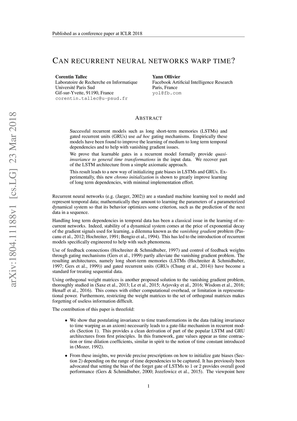 Successful recurrent models such as long short-term memories (LSTMs) and gated recurrent units (GRUs) use ad hoc gating mechanisms. Empirically these models have been found to improve the learning of medium to long term temporal dependencies and to help with vanishing gradient issues. We prove that learnable gates in a recurrent model formally provide quasi- invariance to general time transformations in the input data. We recover part of the LSTM architecture from a simple axiomatic approach. This result leads to a new way of initializing gate biases in LSTMs and GRUs. Ex- perimentally, this new chrono initialization is shown to greatly improve learning of long term dependencies, with minimal implementation effort.