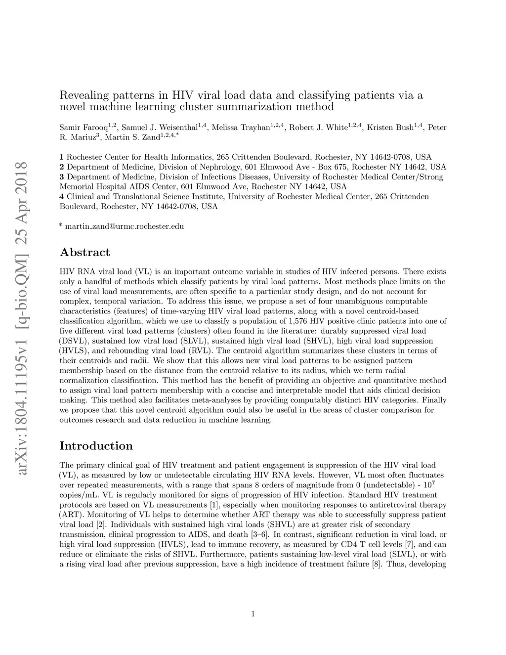 HIV RNA viral load (VL) is an important outcome variable in studies of HIV infected persons. There exists only a handful of methods which classify patients by viral load patterns. Most methods place limits on the use of viral load measurements, are often specific to a particular study design, and do not account for complex, temporal variation. To address this issue, we propose a set of four unambiguous computable characteristics (features) of time-varying HIV viral load patterns, along with a novel centroid-based classification algorithm, which we use to classify a population of 1,576 HIV positive clinic patients into one of five different viral load patterns (clusters) often found in the literature: durably suppressed viral load (DSVL), sustained low viral load (SLVL), sustained high viral load (SHVL), high viral load suppression (HVLS), and rebounding viral load (RVL). The centroid algorithm summarizes these clusters in terms of their centroids and radii. We show that this allows new viral load patterns to be assigned pattern membership based on the distance from the centroid relative to its radius, which we term radial normalization classification. This method has the benefit of providing an objective and quantitative method to assign viral load pattern membership with a concise and interpretable model that aids clinical decision making. This method also facilitates meta-analyses by providing computably distinct HIV categories. Finally we propose that this novel centroid algorithm could also be useful in the areas of cluster comparison for outcomes research and data reduction in machine learning.