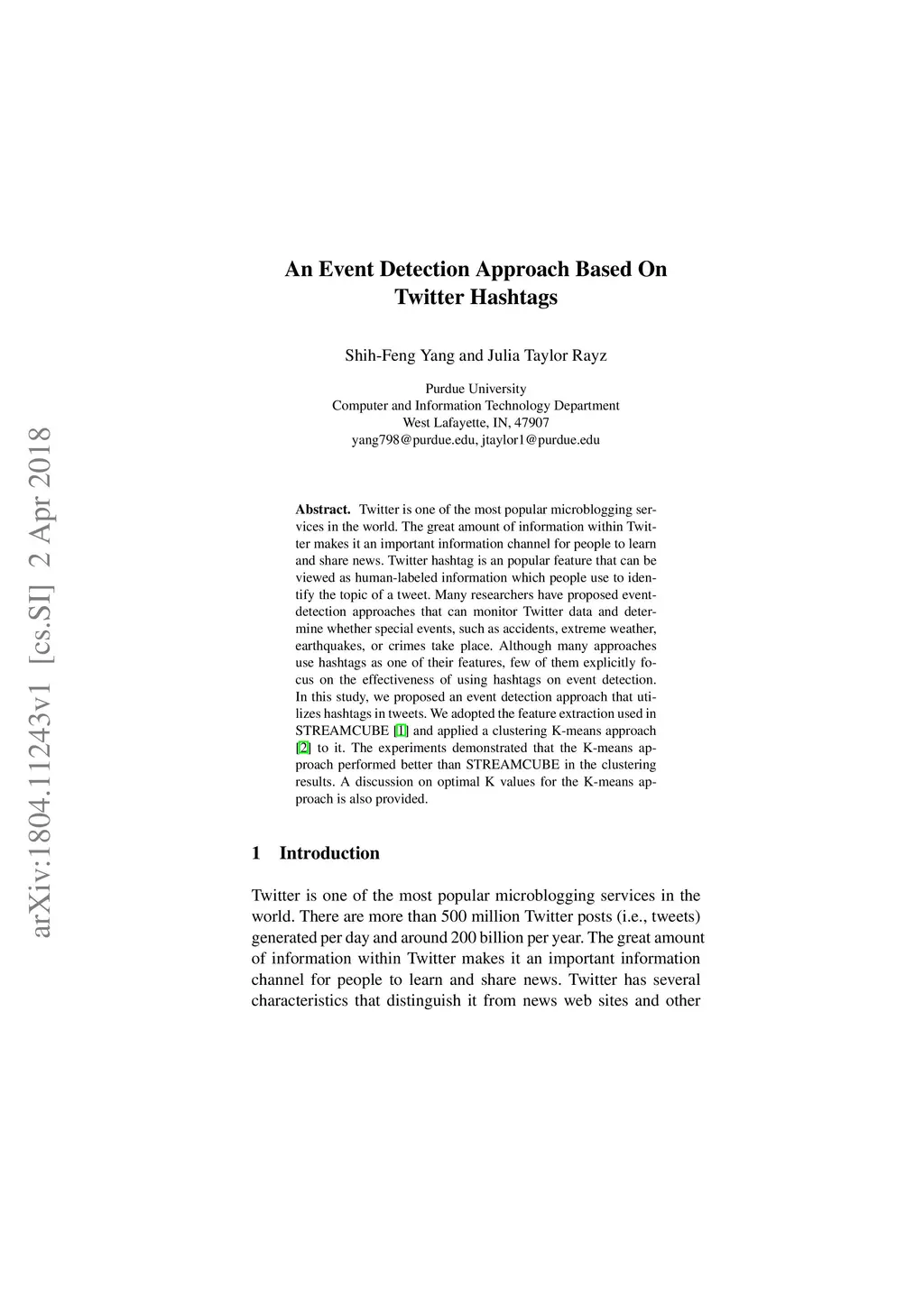 Twitter is one of the most popular microblogging services in the world. The great amount of information within Twitter makes it an important information channel for people to learn and share news. Twitter hashtag is an popular feature that can be viewed as human-labeled information which people use to identify the topic of a tweet. Many researchers have proposed event-detection approaches that can monitor Twitter data and determine whether special events, such as accidents, extreme weather, earthquakes, or crimes take place. Although many approaches use hashtags as one of their features, few of them explicitly focus on the effectiveness of using hashtags on event detection. In this study, we proposed an event detection approach that utilizes hashtags in tweets. We adopted the feature extraction used in STREAMCUBE and applied a clustering K-means approach to it. The experiments demonstrated that the K-means approach performed better than STREAMCUBE in the clustering results. A discussion on optimal K values for the K-means approach is also provided.