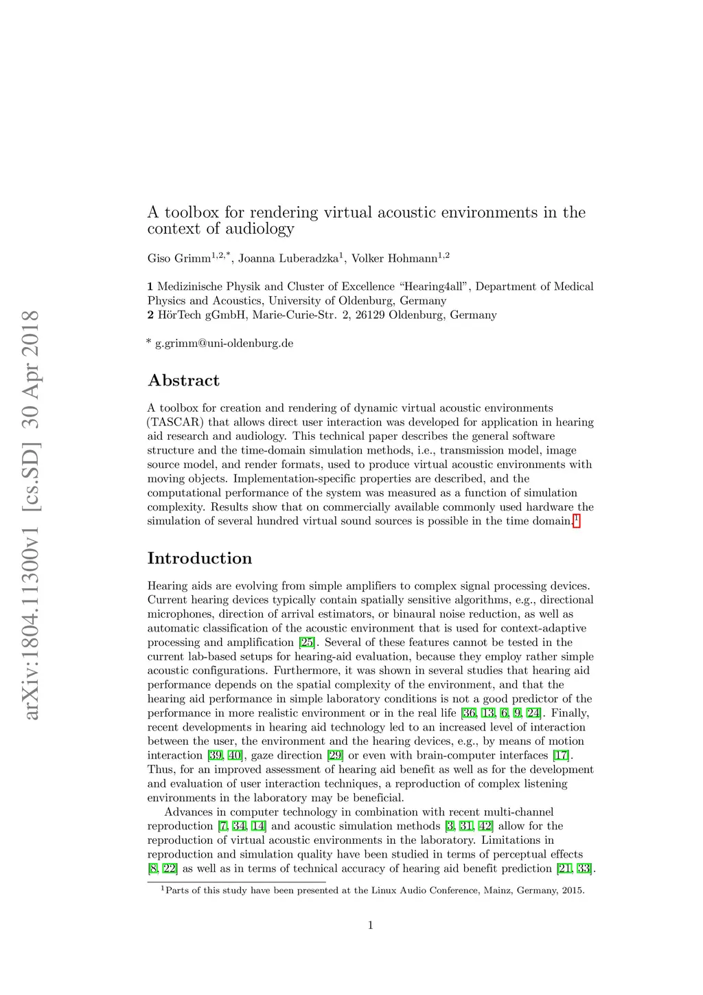 A toolbox for creation and rendering of dynamic virtual acoustic environments (TASCAR) that allows direct user interaction was developed for application in hearing aid research and audiology. This technical paper describes the general software structure and the time-domain simulation methods, i.e., transmission model, image source model, and render formats, used to produce virtual acoustic environments with moving objects. Implementation-specific properties are described, and the computational performance of the system was measured as a function of simulation complexity. Results show that on commercially available commonly used hardware the simulation of several hundred virtual sound sources is possible in the time domain.