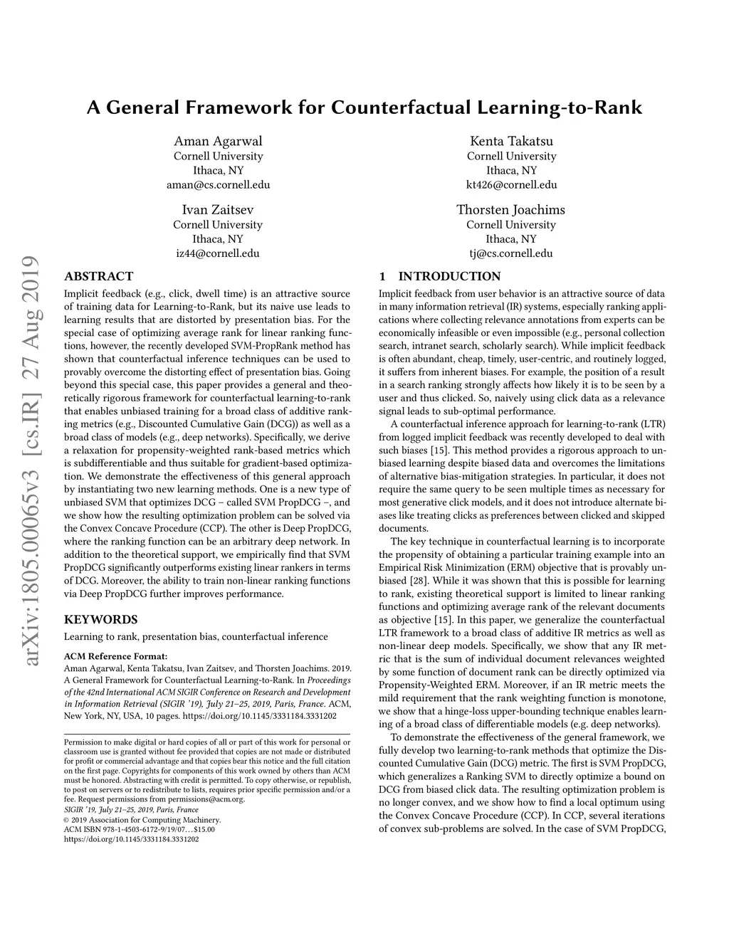 Implicit feedback (e.g., click, dwell time) is an attractive source of training data for Learning-to-Rank, but its naive use leads to learning results that are distorted by presentation bias. For the special case of optimizing average rank for linear ranking functions, however, the recently developed SVM-PropRank method has shown that counterfactual inference techniques can be used to provably overcome the distorting effect of presentation bias. Going beyond this special case, this paper provides a general and theoretically rigorous framework for counterfactual learning-to-rank that enables unbiased training for a broad class of additive ranking metrics (e.g., Discounted Cumulative Gain (DCG)) as well as a broad class of models (e.g., deep networks). Specifically, we derive a relaxation for propensity-weighted rank-based metrics which is subdifferentiable and thus suitable for gradient-based optimization. We demonstrate the effectiveness of this general approach by instantiating two new learning methods. One is a new type of unbiased SVM that optimizes DCG -- called SVM PropDCG --, and we show how the resulting optimization problem can be solved via the Convex Concave Procedure (CCP). The other is Deep PropDCG, where the ranking function can be an arbitrary deep network. In addition to the theoretical support, we empirically find that SVM PropDCG significantly outperforms existing linear rankers in terms of DCG. Moreover, the ability to train non-linear ranking functions via Deep PropDCG further improves performance.