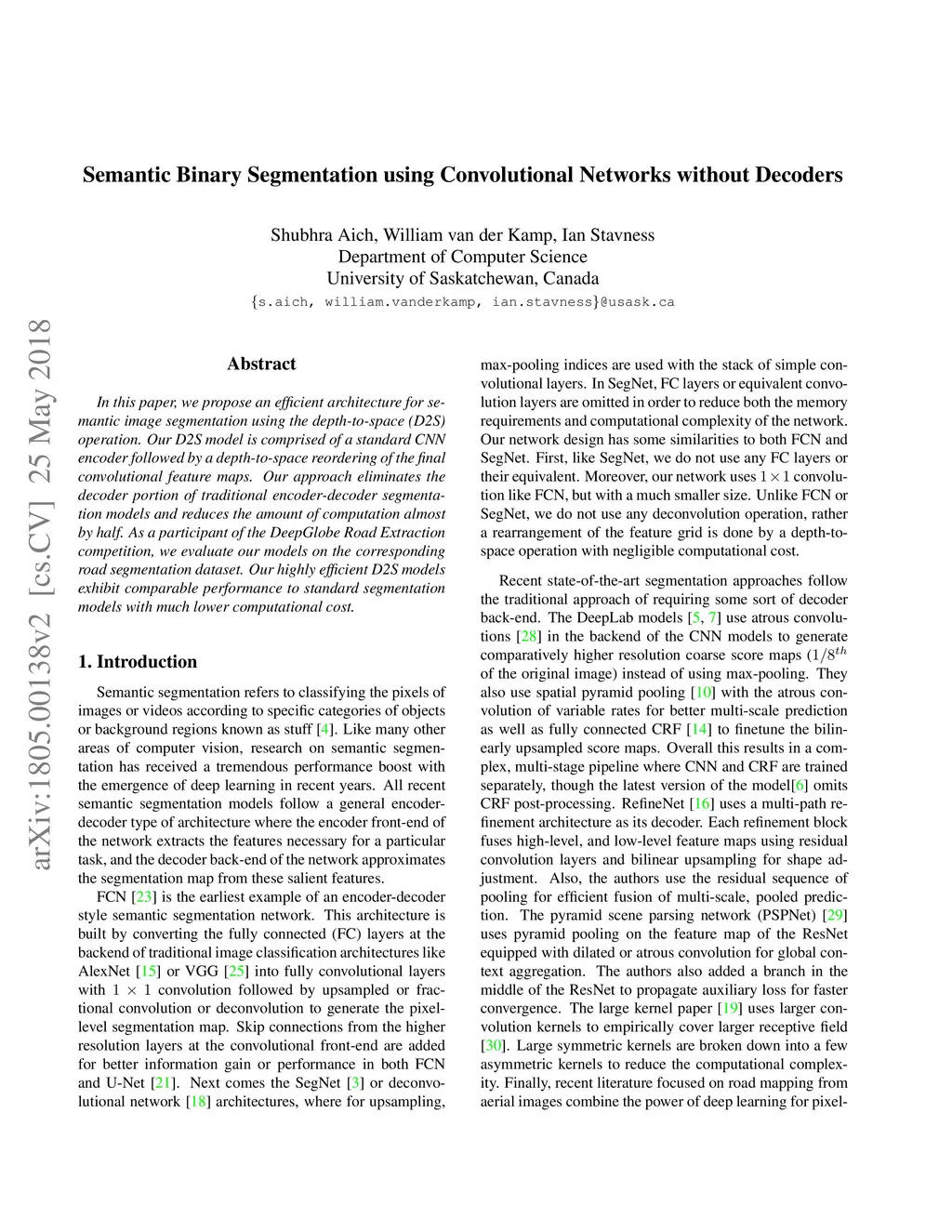 In this paper, we propose an efficient architecture for semantic image segmentation using the depth-to-space (D2S) operation. Our D2S model is comprised of a standard CNN encoder followed by a depth-to-space reordering of the final convolutional feature maps. Our approach eliminates the decoder portion of traditional encoder-decoder segmentation models and reduces the amount of computation almost by half. As a participant of the DeepGlobe Road Extraction competition, we evaluate our models on the corresponding road segmentation dataset. Our highly efficient D2S models exhibit comparable performance to standard segmentation models with much lower computational cost.