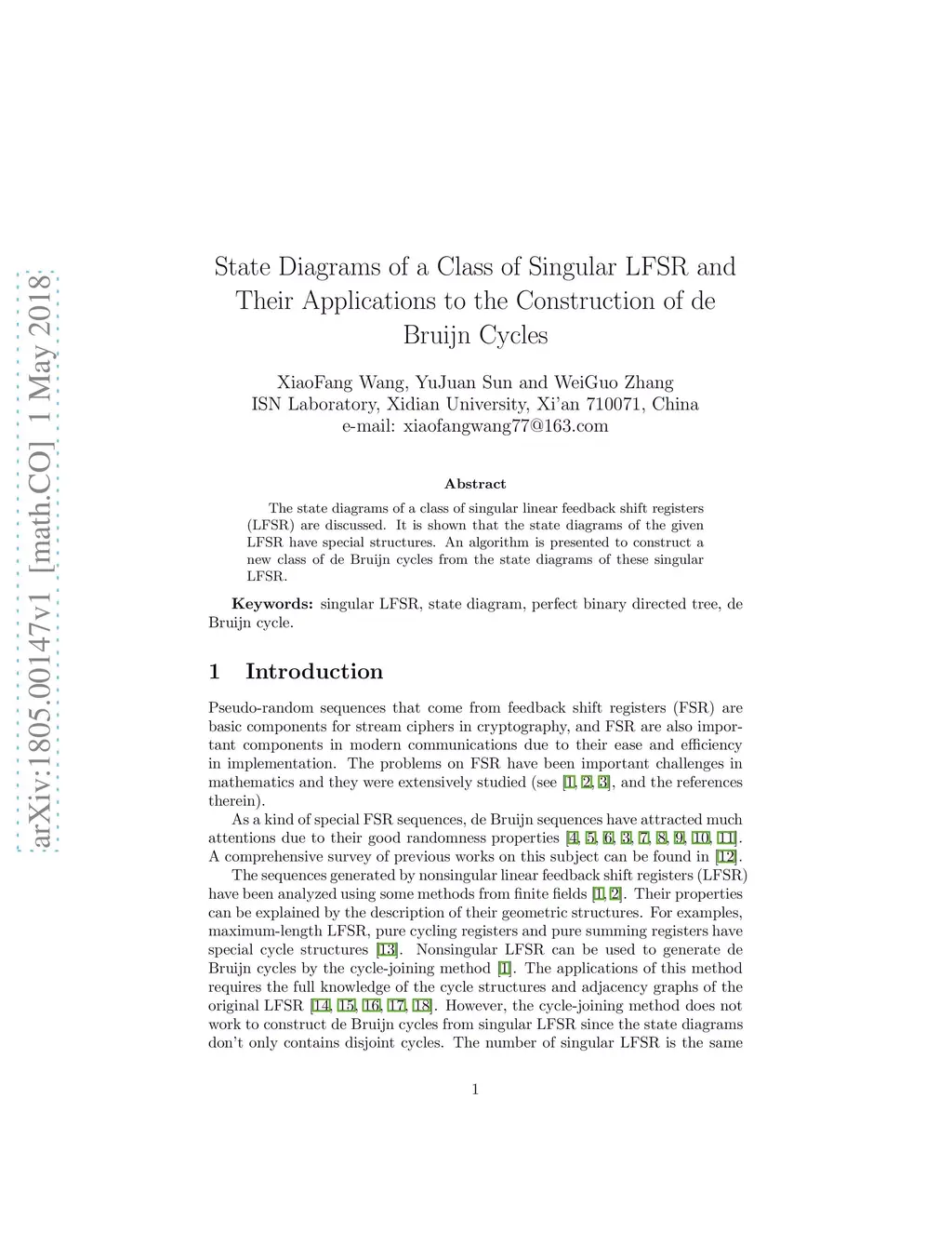 The state diagrams of a class of singular linear feedback shift registers (LFSR) are discussed. It is shown that the state diagrams of the given LFSR have special structures. An algorithm is presented to construct a new class of de Bruijn cycles from the state diagrams of these singular LFSR.