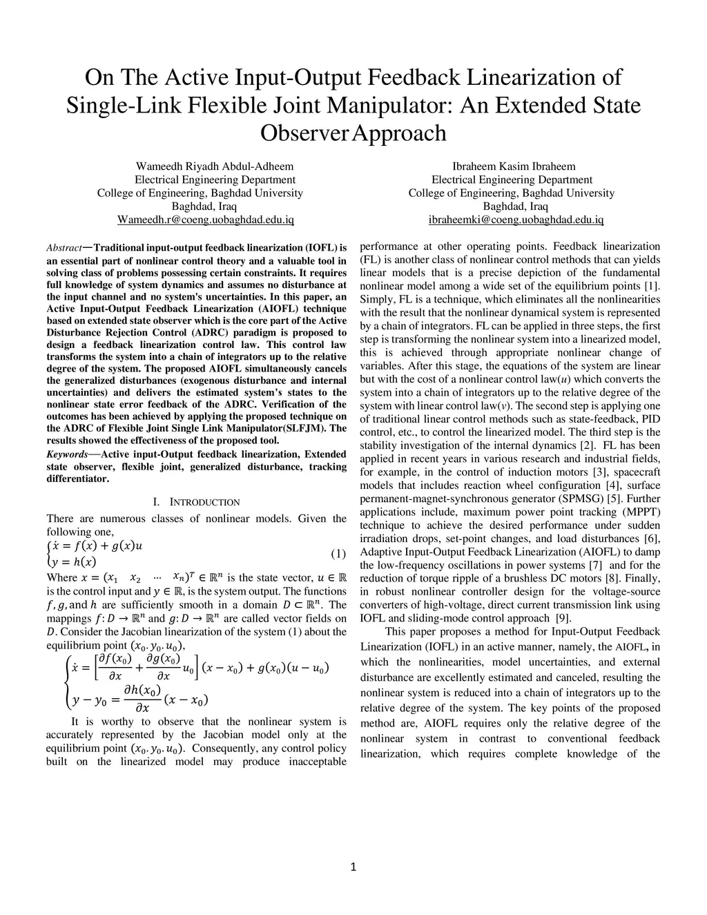 Traditional Input-Output Feedback Linearization (IOFL) requires full knowledge of system dynamics and assumes no disturbance at the input channel and no system's uncertainties. In this paper, a model-free Active Input-Output Feedback Linearization (AIOFL) technique based on an Improved Active Disturbance Rejection Control (IADRC) paradigm is proposed to design feedback linearization control law for a generalized nonlinear system with known relative degree. The Linearization Control Law(LCL) is composed of a scaled generalized disturbance estimated by an Improved Nonlinear Extended State Observer (INLESO) with saturation-like behavior and the nominal control law produced by an Improved Nonlinear State Error Feedback (INLSEF). The proposed AIOFL cancels in real-time fashion the generalized disturbances which represent all the unwanted dynamics, exogenous disturbances, and system uncertainties and transforms the system into a chain of integrators up to the relative degree of the system, the only information required about the nonlinear system. Stability analysis has been conducted based on Lyapunov functions and revealed the convergence of the INLESO and the asymptotic stability of the closed-loop system. Verification of the outcomes has been achieved by applying the proposed AIOFL technique on the Flexible Joint Single Link Manipulator (SLFJM). The simulations results validated the effectiveness of the proposed AIOFL tool based on IADRC as compared to the conventional ADRC based AIOFL and the traditional IOFL techniques.