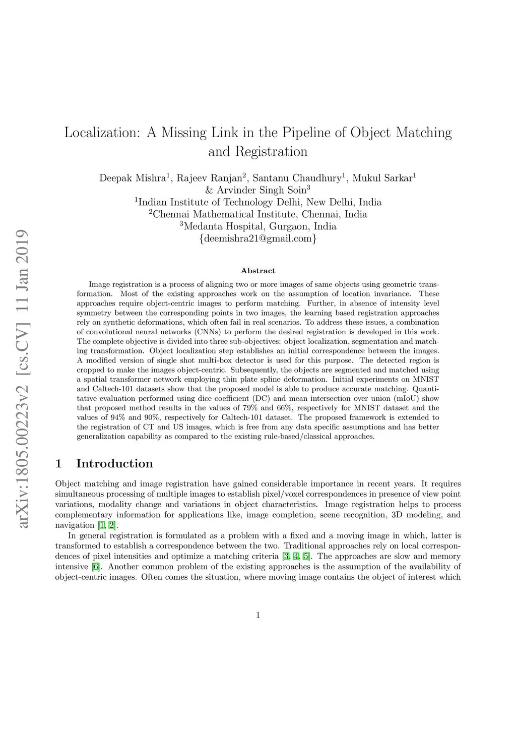 Image registration is a process of aligning two or more images of same objects using geometric transformation. Most of the existing approaches work on the assumption of location invariance. These approaches require object-centric images to perform matching. Further, in absence of intensity level symmetry between the corresponding points in two images, the learning based registration approaches rely on synthetic deformations, which often fail in real scenarios. To address these issues, a combination of convolutional neural networks (CNNs) to perform the desired registration is developed in this work. The complete objective is divided into three sub-objectives: object localization, segmentation and matching transformation. Object localization step establishes an initial correspondence between the images. A modified version of single shot multi-box detector is used for this purpose. The detected region is cropped to make the images object-centric. Subsequently, the objects are segmented and matched using a spatial transformer network employing thin plate spline deformation. Initial experiments on MNIST and Caltech-101 datasets show that the proposed model is able to produce accurate matching. Quantitative evaluation performed using dice coefficient (DC) and mean intersection over union (mIoU) show that proposed method results in the values of 79% and 66%, respectively for MNIST dataset and the values of 94% and 90%, respectively for Caltech-101 dataset. The proposed framework is extended to the registration of CT and US images, which is free from any data specific assumptions and has better generalization capability as compared to the existing rule-based/classical approaches.
