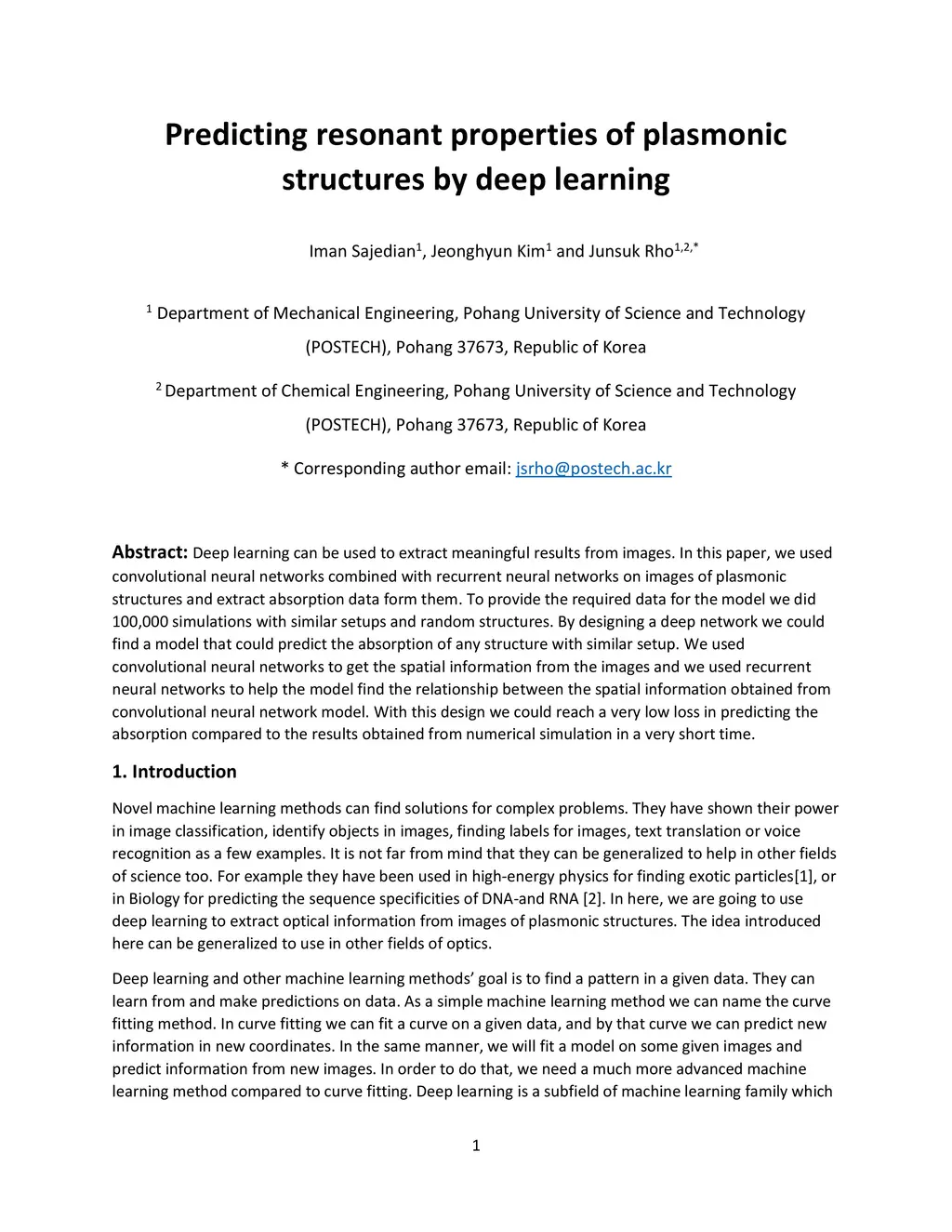 Deep learning can be used to extract meaningful results from images. In this paper, we used convolutional neural networks combined with recurrent neural networks on images of plasmonic structures and extract absorption data form them. To provide the required data for the model we did 100,000 simulations with similar setups and random structures. By designing a deep network we could find a model that could predict the absorption of any structure with similar setup. We used convolutional neural networks to get the spatial information from the images and we used recurrent neural networks to help the model find the relationship between the spatial information obtained from convolutional neural network model. With this design we could reach a very low loss in predicting the absorption compared to the results obtained from numerical simulation in a very short time.