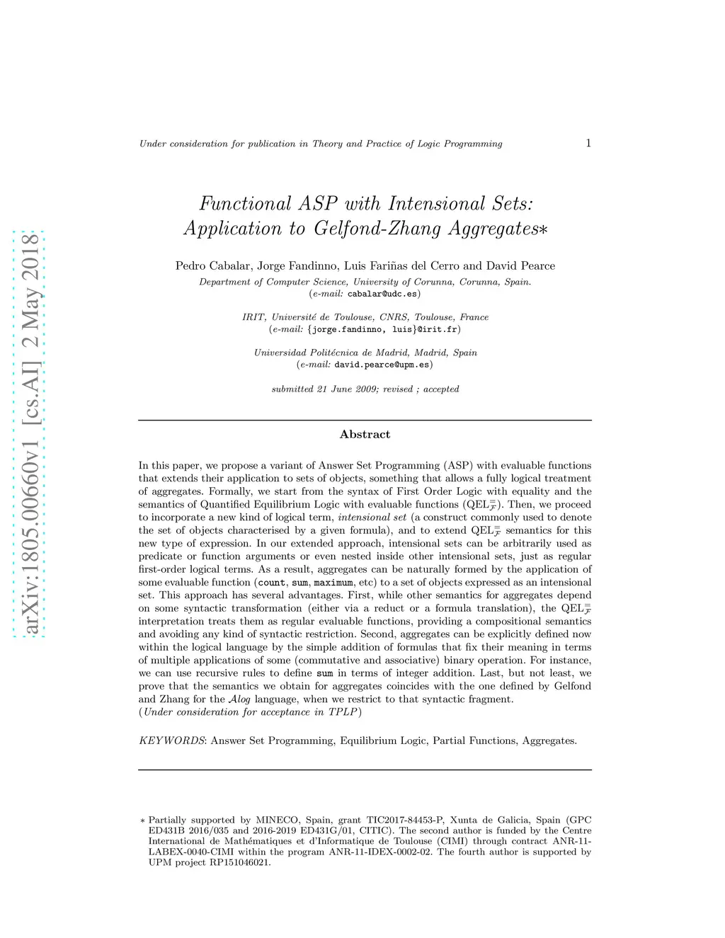 Functional ASP with Intensional Sets: Application to Gelfond-Zhang