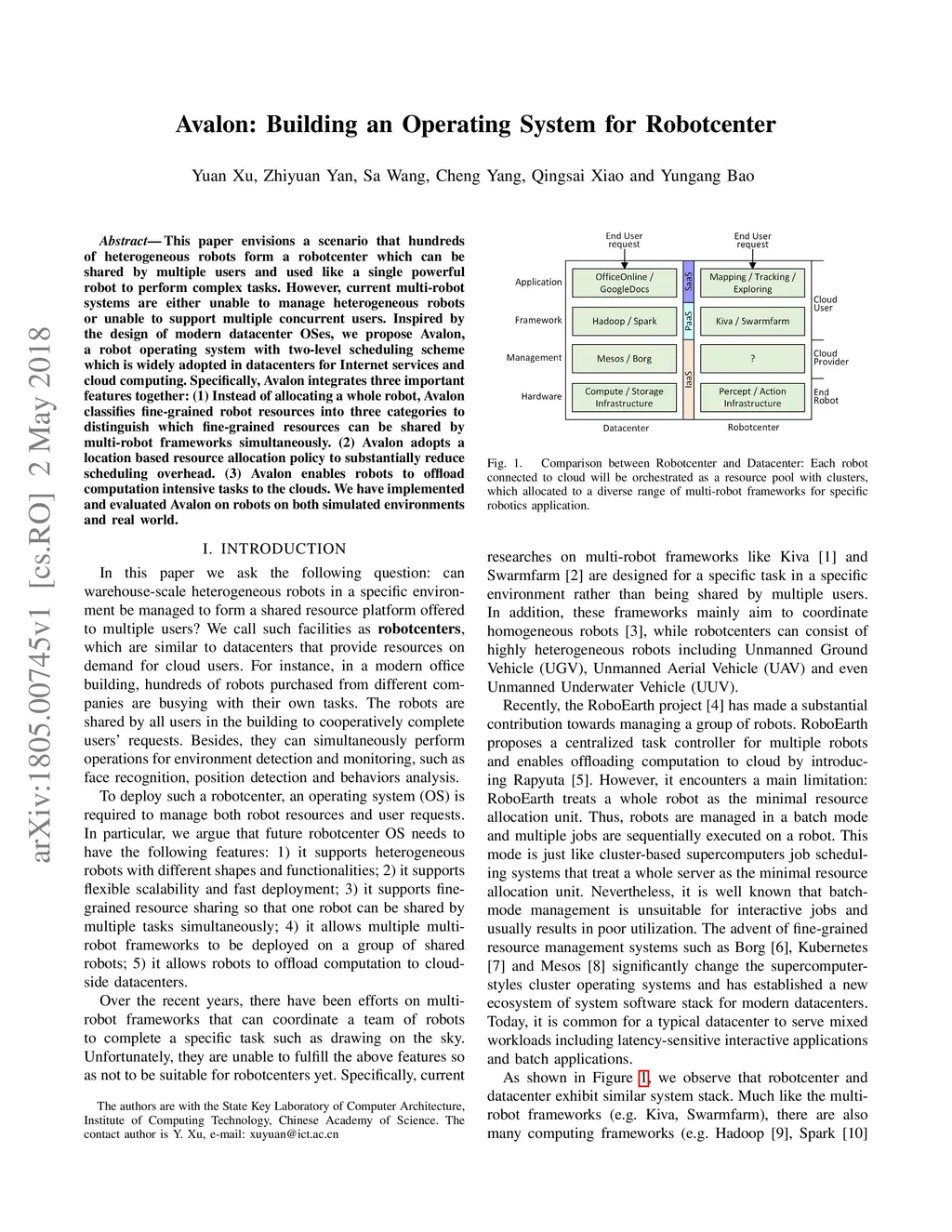 This paper envisions a scenario that hundreds of heterogeneous robots form a robotcenter which can be shared by multiple users and used like a single powerful robot to perform complex tasks. However, current multi-robot systems are either unable to manage heterogeneous robots or unable to support multiple concurrent users. Inspired by the design of modern datacenter OSes, we propose Avalon, a robot operating system with two-level scheduling scheme which is widely adopted in datacenters for Internet services and cloud computing. Specifically, Avalon integrates three important features together: (1) Instead of allocating a whole robot, Avalon classifies fine-grained robot resources into three categories to distinguish which fine-grained resources can be shared by multi-robot frameworks simultaneously. (2) Avalon adopts a location based resource allocation policy to substantially reduce scheduling overhead. (3) Avalon enables robots to offload computation intensive tasks to the clouds.We have implemented and evaluated Avalon on robots on both simulated environments and real world.